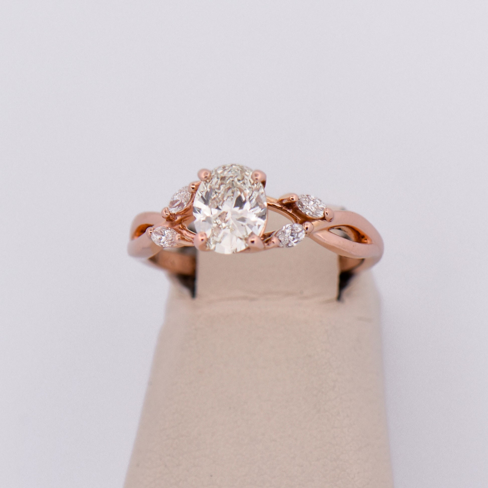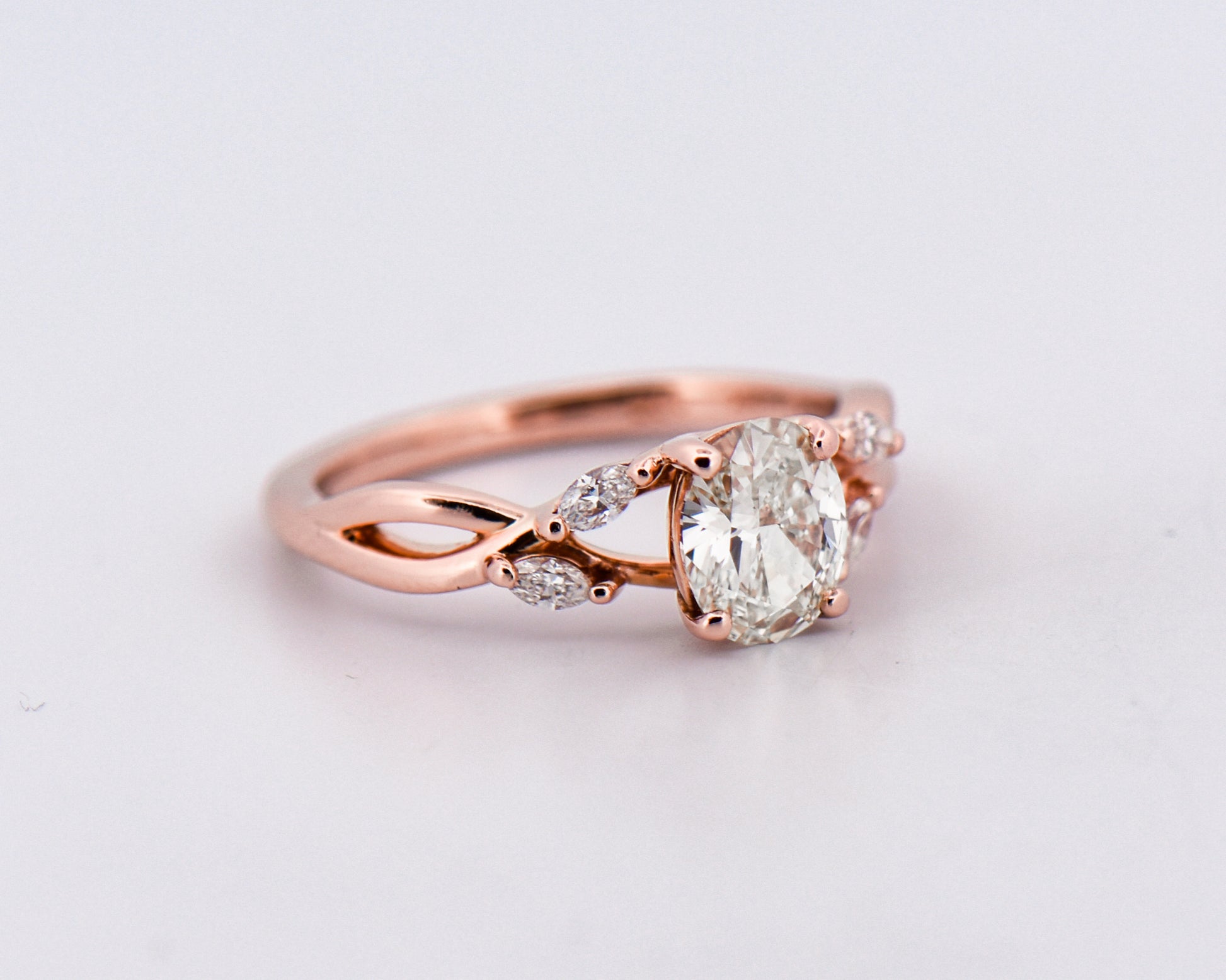 Details: Engagement ring in 14k rose gold featuring a 0.82ct GIA-certified oval diamond (SI1 clarity, I color), with 0.20ctw of accent diamonds (SI clarity, G-H color).