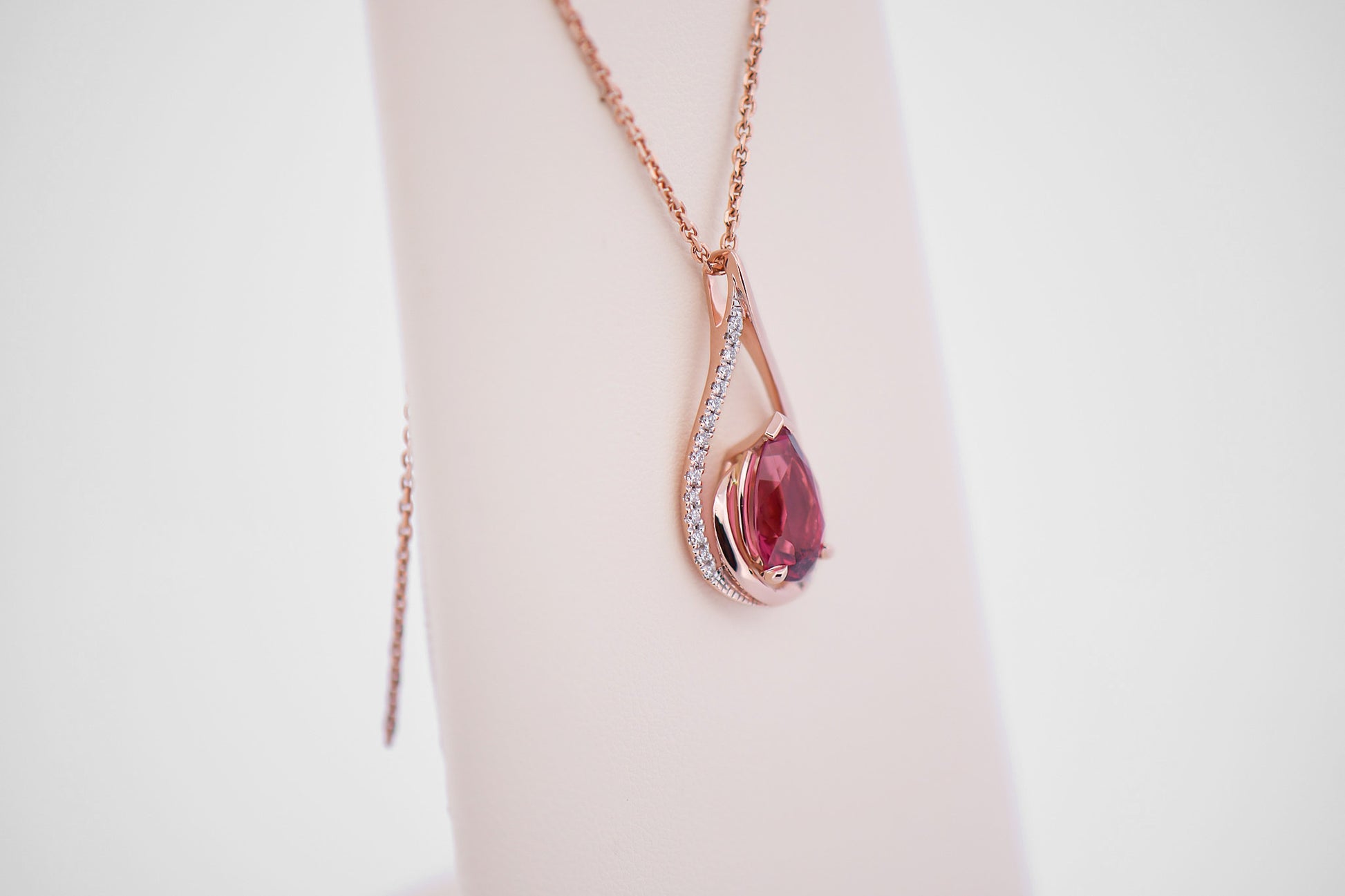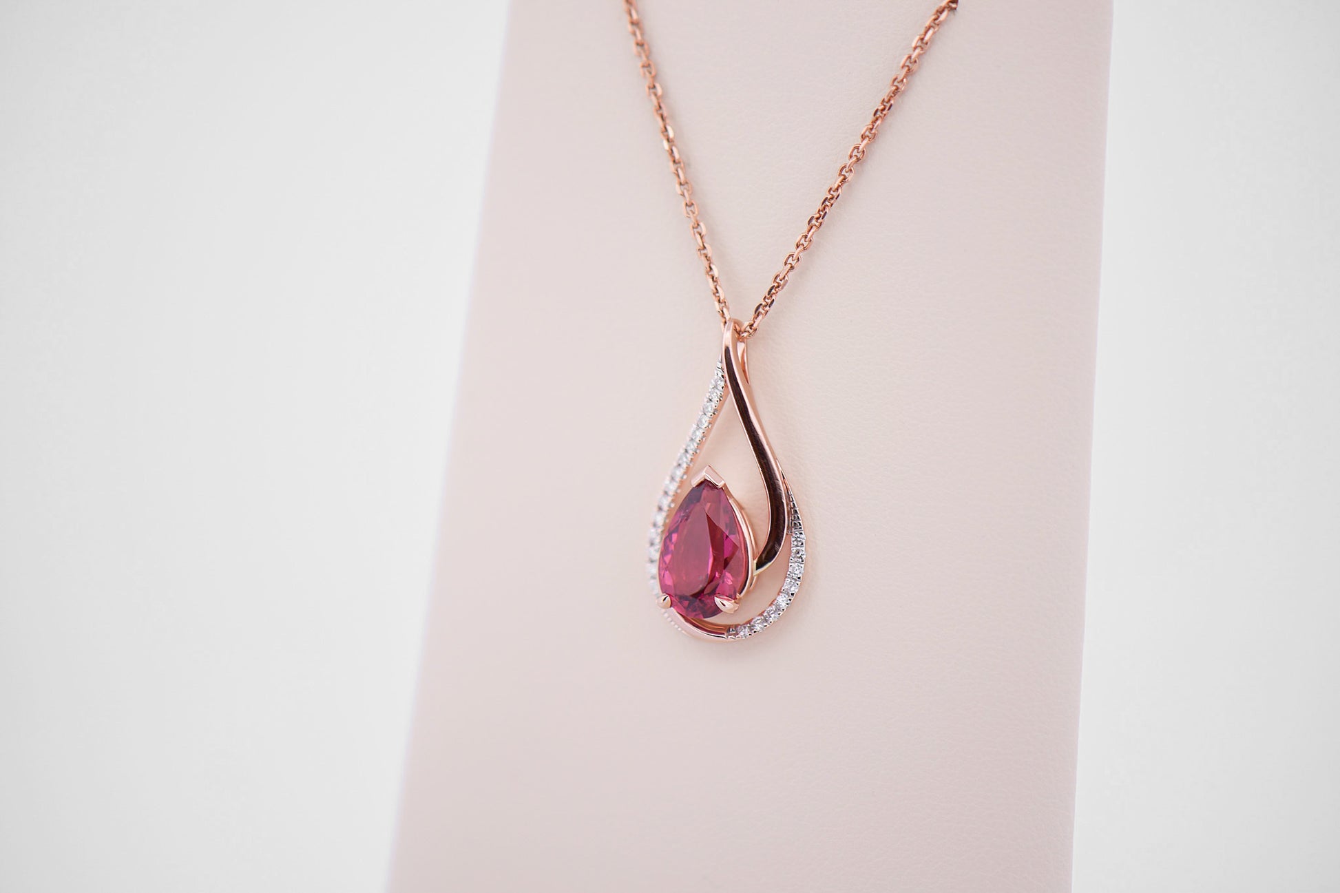Details: Swirl pendant in 14k rose gold featuring an approx. 1.95ct pear-shaped hot pink tourmaline and approx. 0.15ctw diamond accents (VS clarity, G–H color).