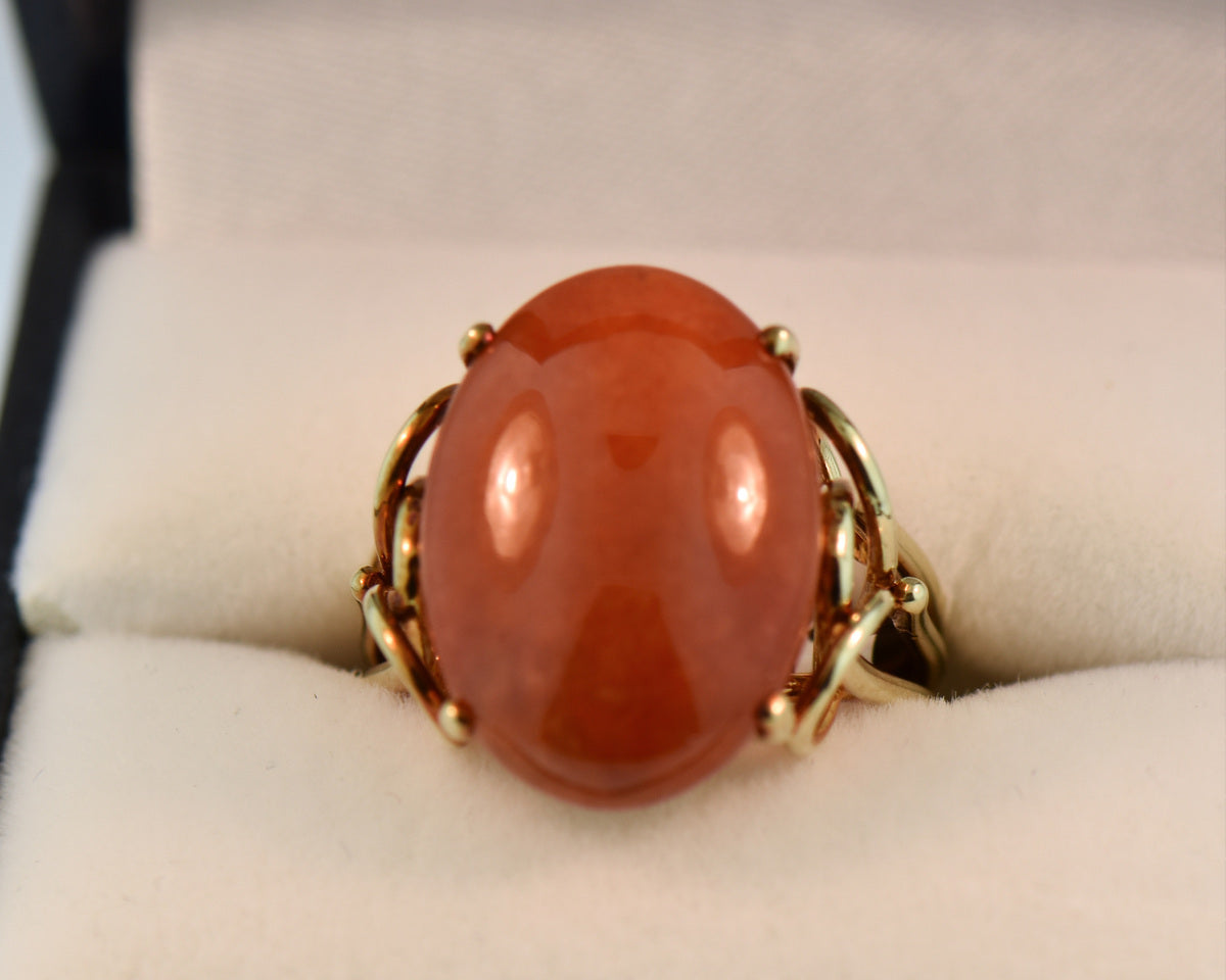Details: Estate 14k yellow gold ring set with an oval jadeite jade cabochon (18x13mm, estimated to weigh over 7ct), circa 1990.