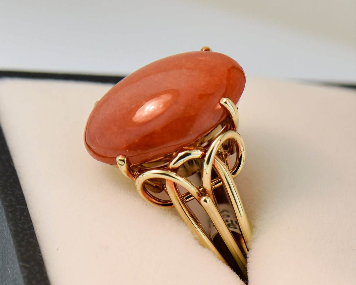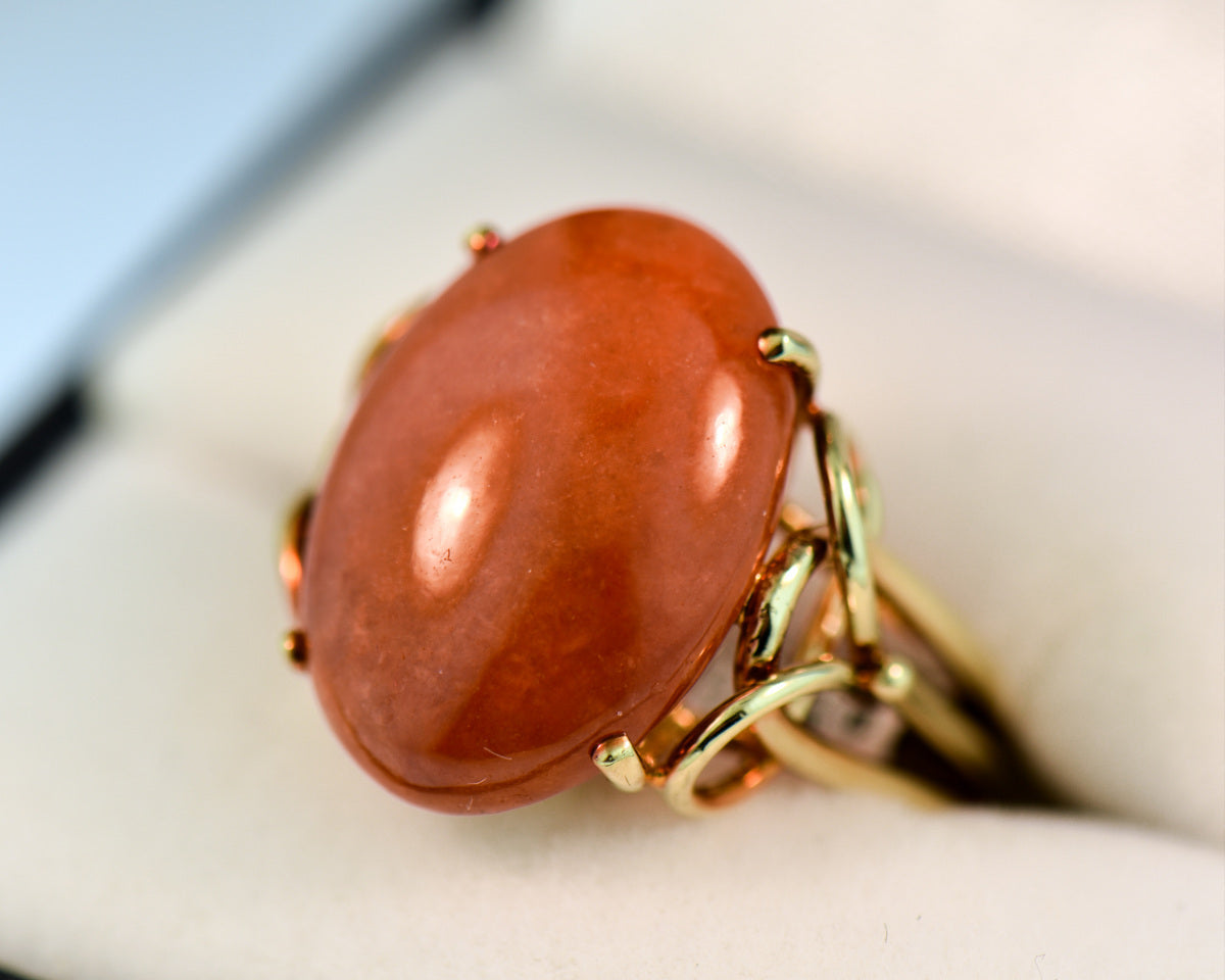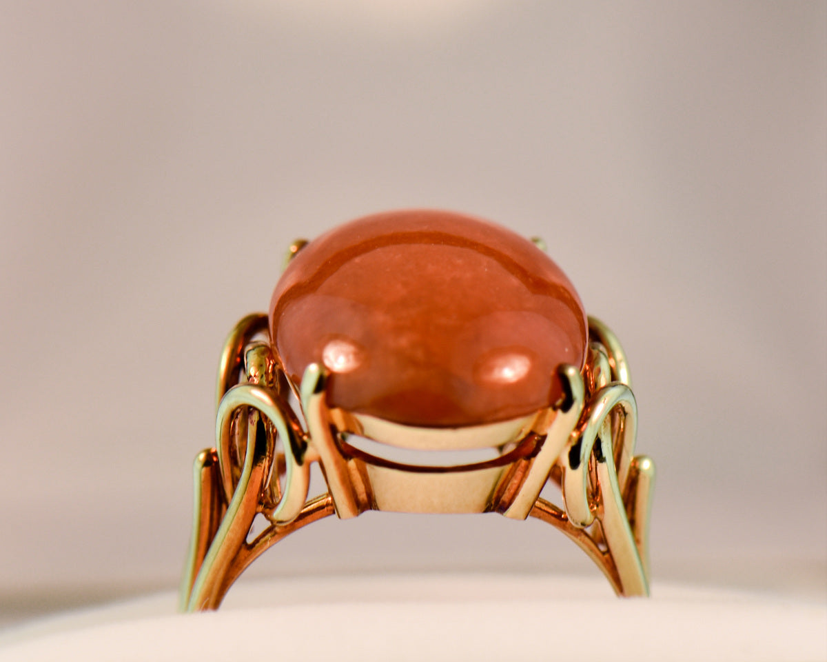 This particular red jade features a deep, burnt sienna color with hints of gold, making it highly sought after by collectors of jade. It is set as a solitaire cabochon in yellow gold, with a wire-work gallery that wraps around the base of the gem and forms a three-part shank. The gem boasts a fantastic luster and shine that must be seen in person to be fully appreciated.