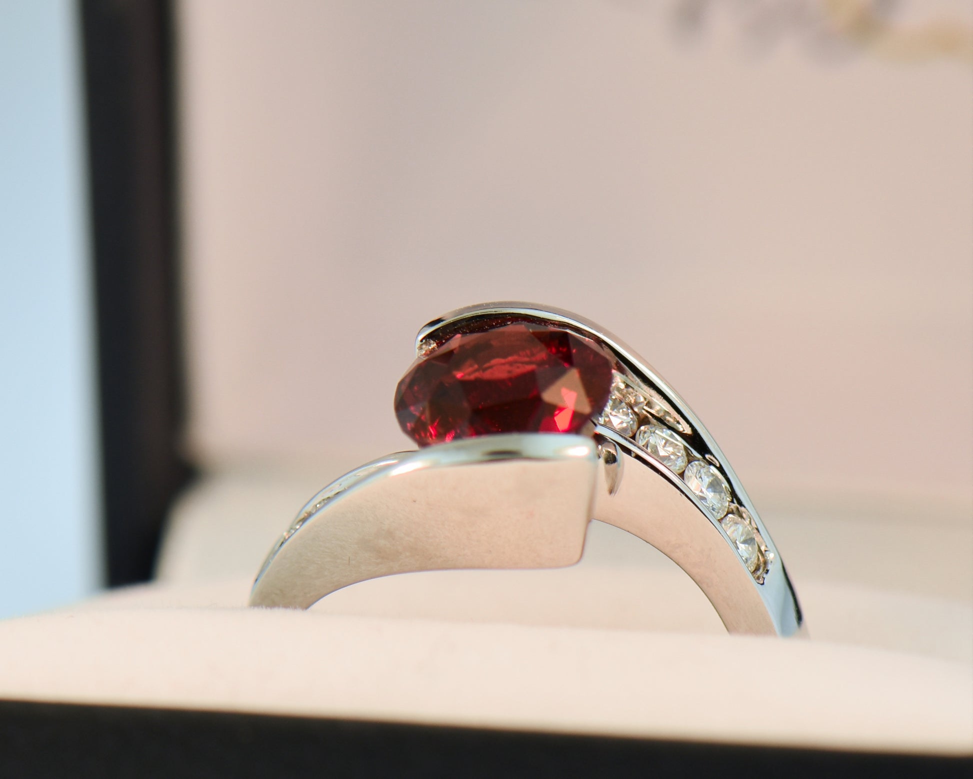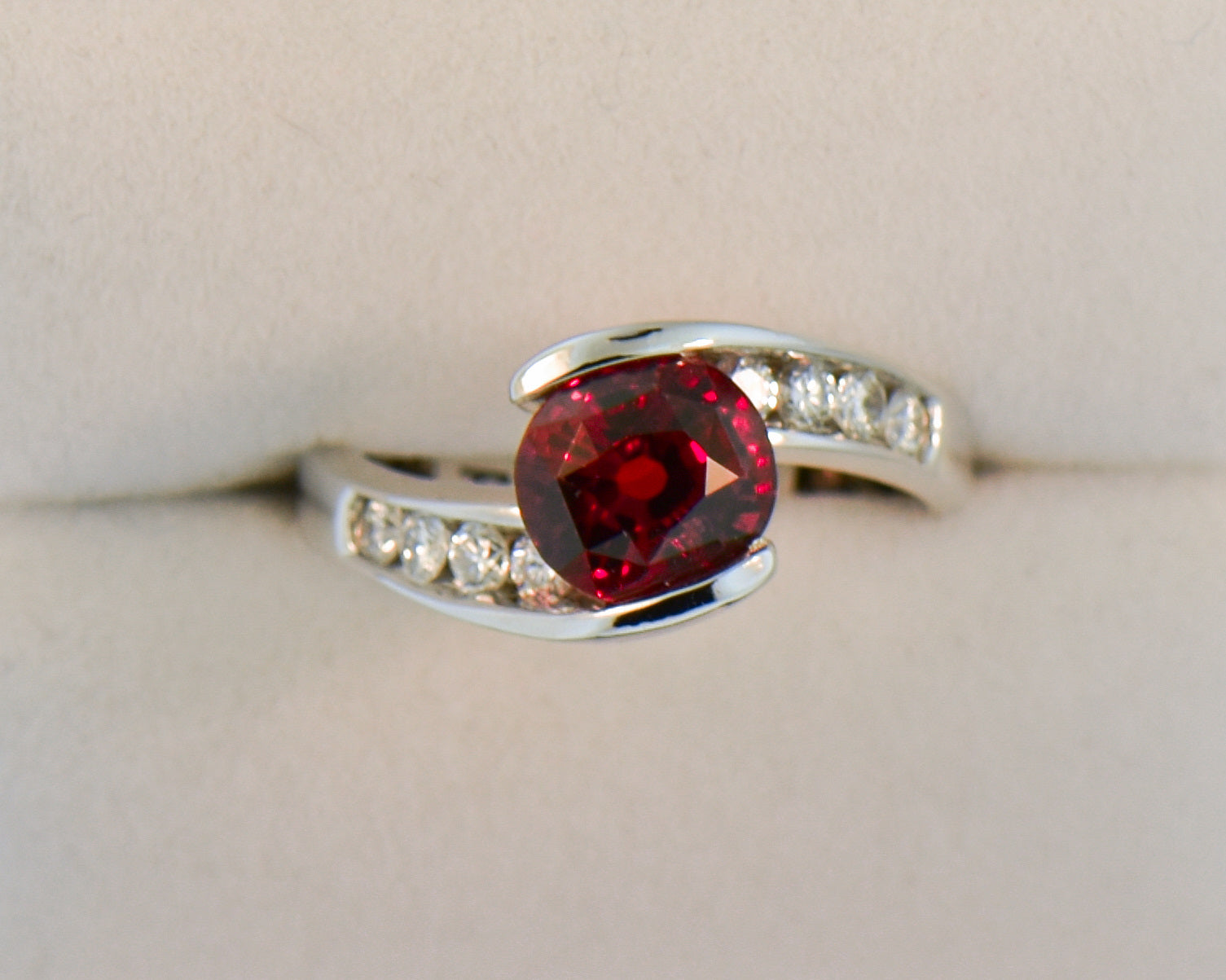 Details: custom 14k white gold ring set with 2.52ct oval red spinel (Burma, untreated) and .35ctw round diamond accents (SI GH).