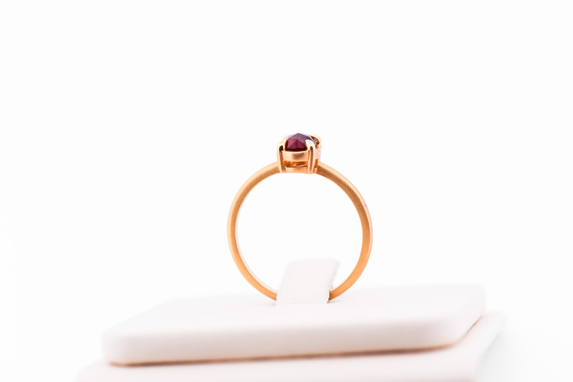 Delicate yet richly colored, this rose-cut ruby solitaire ring offers a refined take on a timeless design. Set in 14k yellow gold, the ruby displays a deep, romantic red hue, its softly faceted surface creating a gentle, glowing shimmer rather than a sharp brilliance.