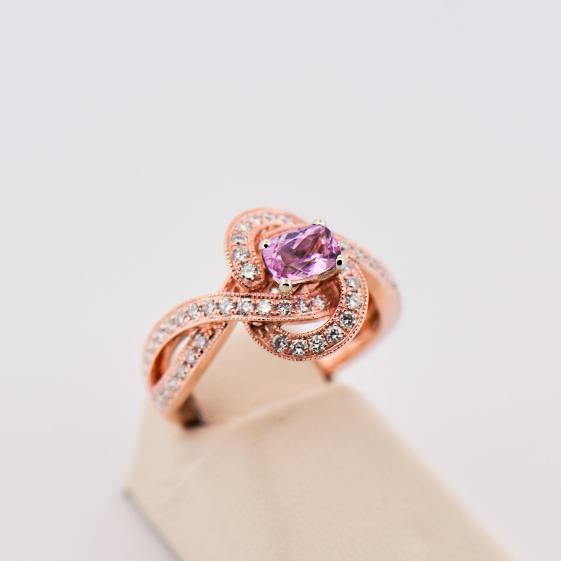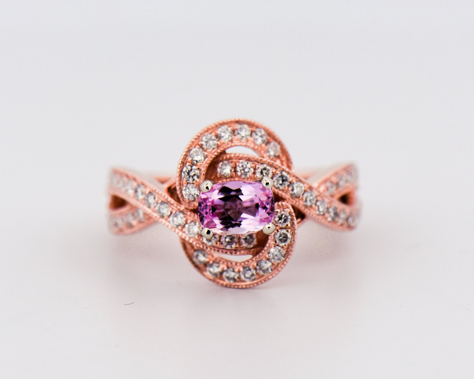 Details: Size 7 custom-made 14k rose gold knot ring featuring a 0.78ct cushion pink topaz (untreated, from Brazil) and 0.69ct of round natural diamond accents (SI GH quality).