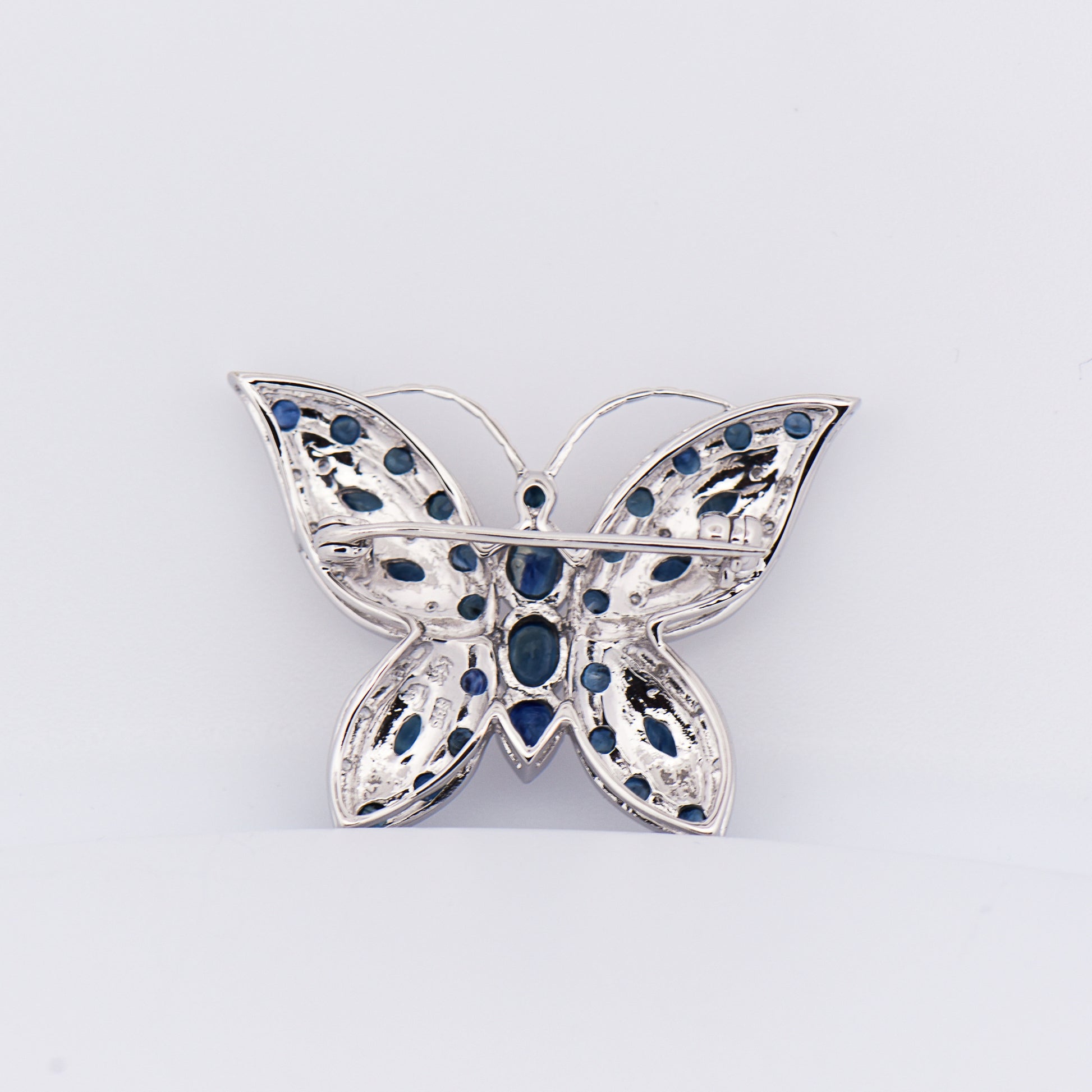 Whimsical and radiant, this estate sapphire butterfly pin/pendant is a delightful blend of elegance and versatility. Crafted in luminous white gold, the piece is modeled after a fluttering butterfly adorned with approximately 2.00 carats of vibrant blue sapphires. Each gem is thoughtfully set to catch the light from every angle, giving the wings a lively, glimmering sparkle.