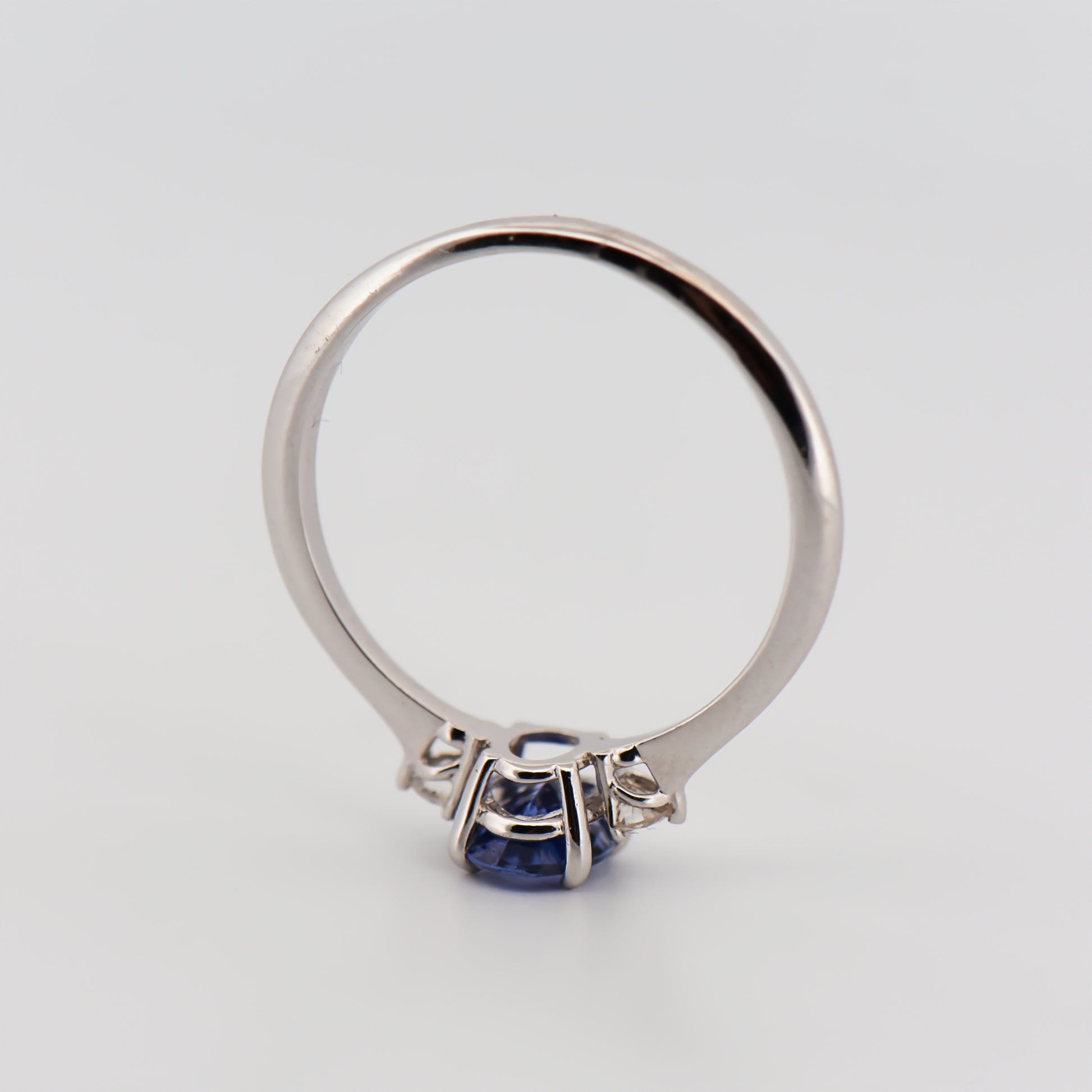 Details: 14k white gold ring featuring a 0.90ct oval sapphire and 0.10ctw round diamonds (SI clarity); contemporary classic.