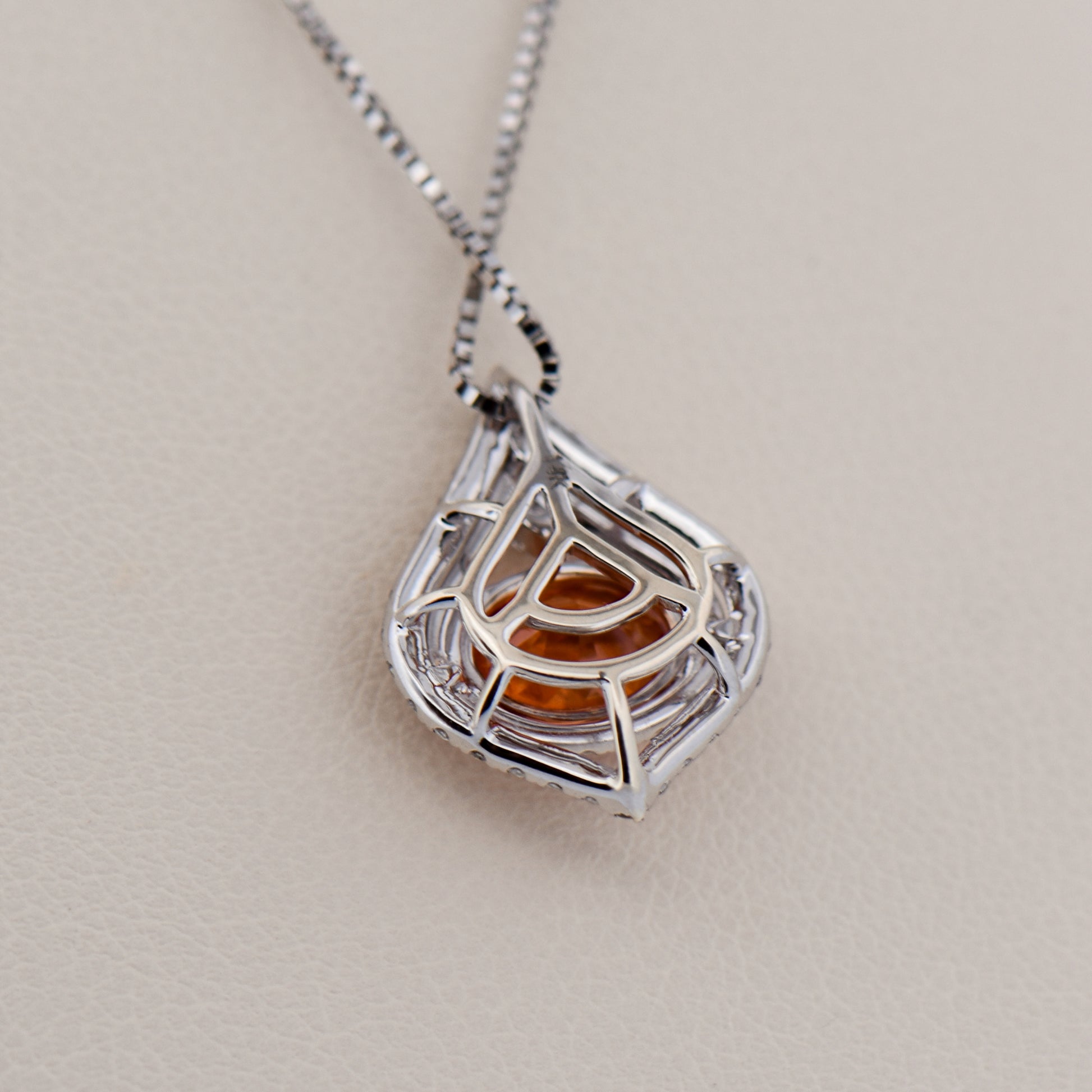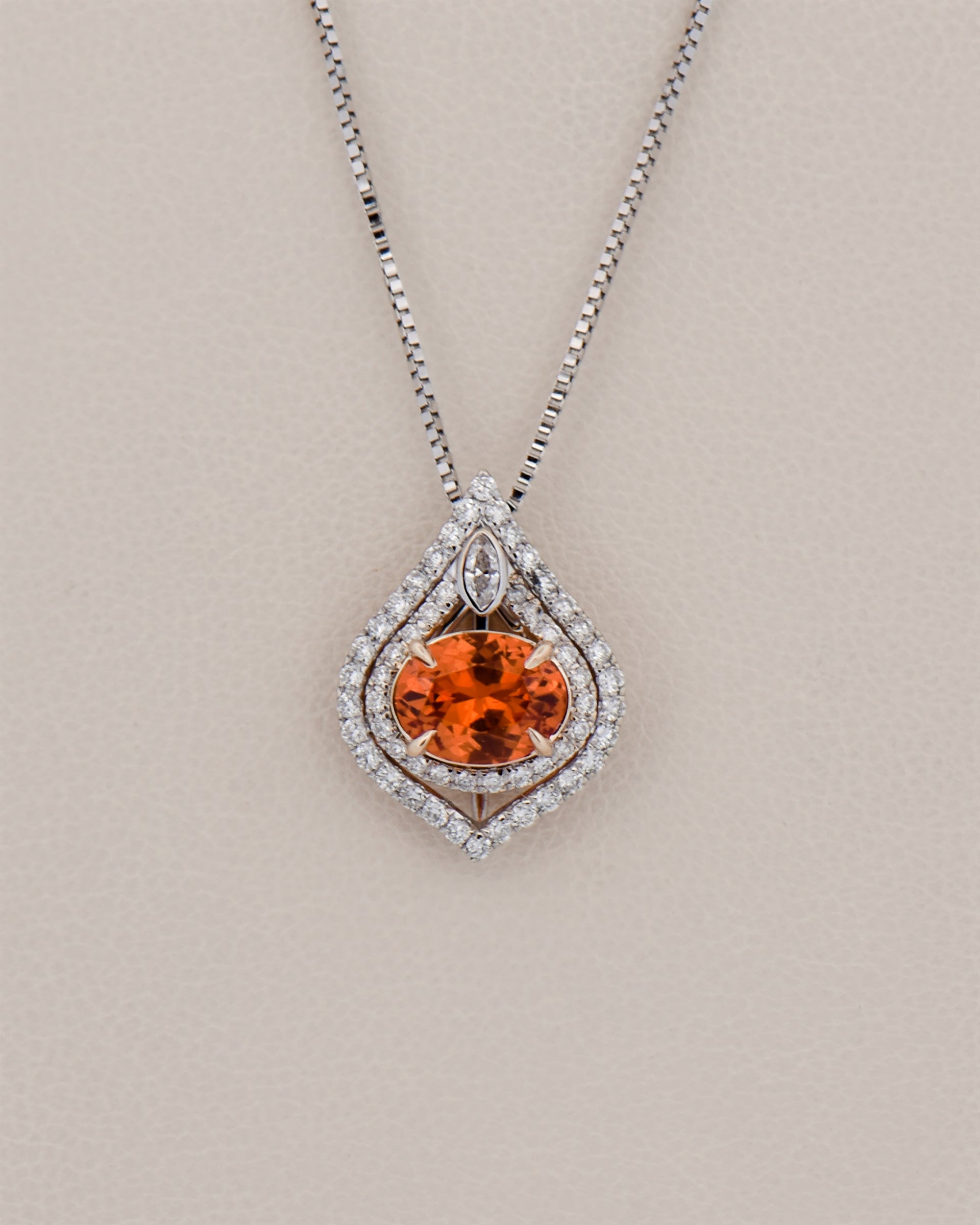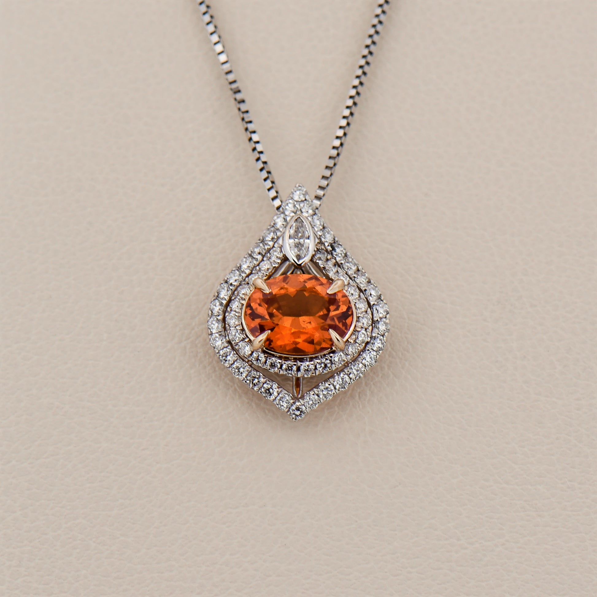 Colorful, radiant, and undeniably unique, this spessartite and diamond pendant showcases the fiery beauty of a rare gemstone. At its center rests a 1.28-carat oval spessartite, glowing with a vivid orange hue that evokes warmth and vitality. Surrounding the gem, 0.35-carats of diamonds offer a striking contrast, their icy white sparkle enhancing the spessartite's rich color.