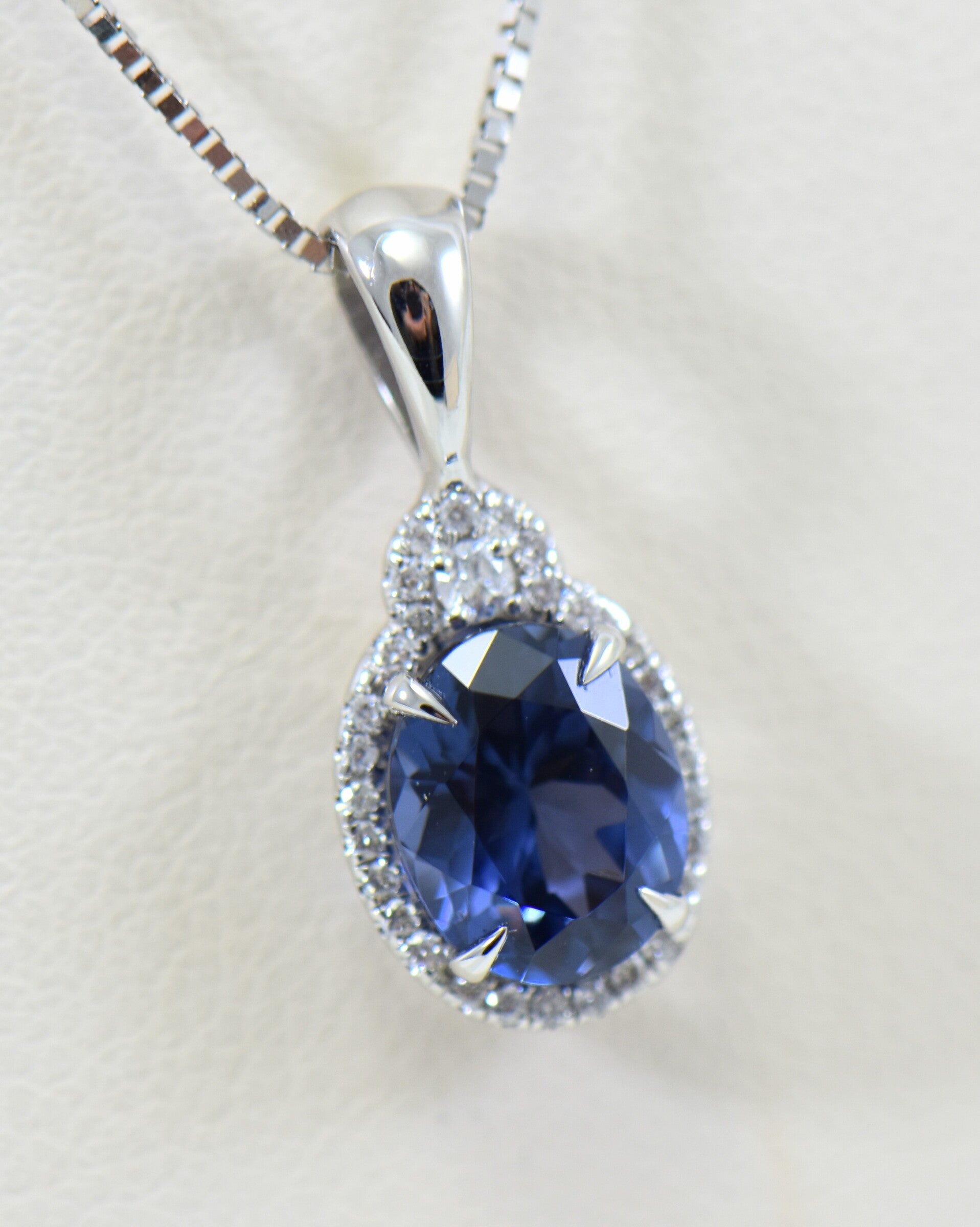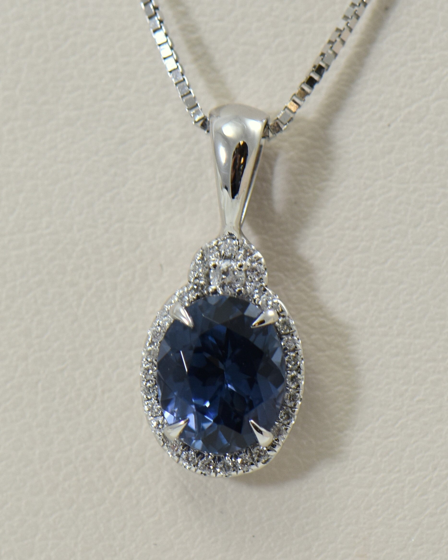 Details: 14k white gold pendant set with 1.63ct oval blue spinel (untreated, Burma) and .13ct round diamonds (I1 GH).