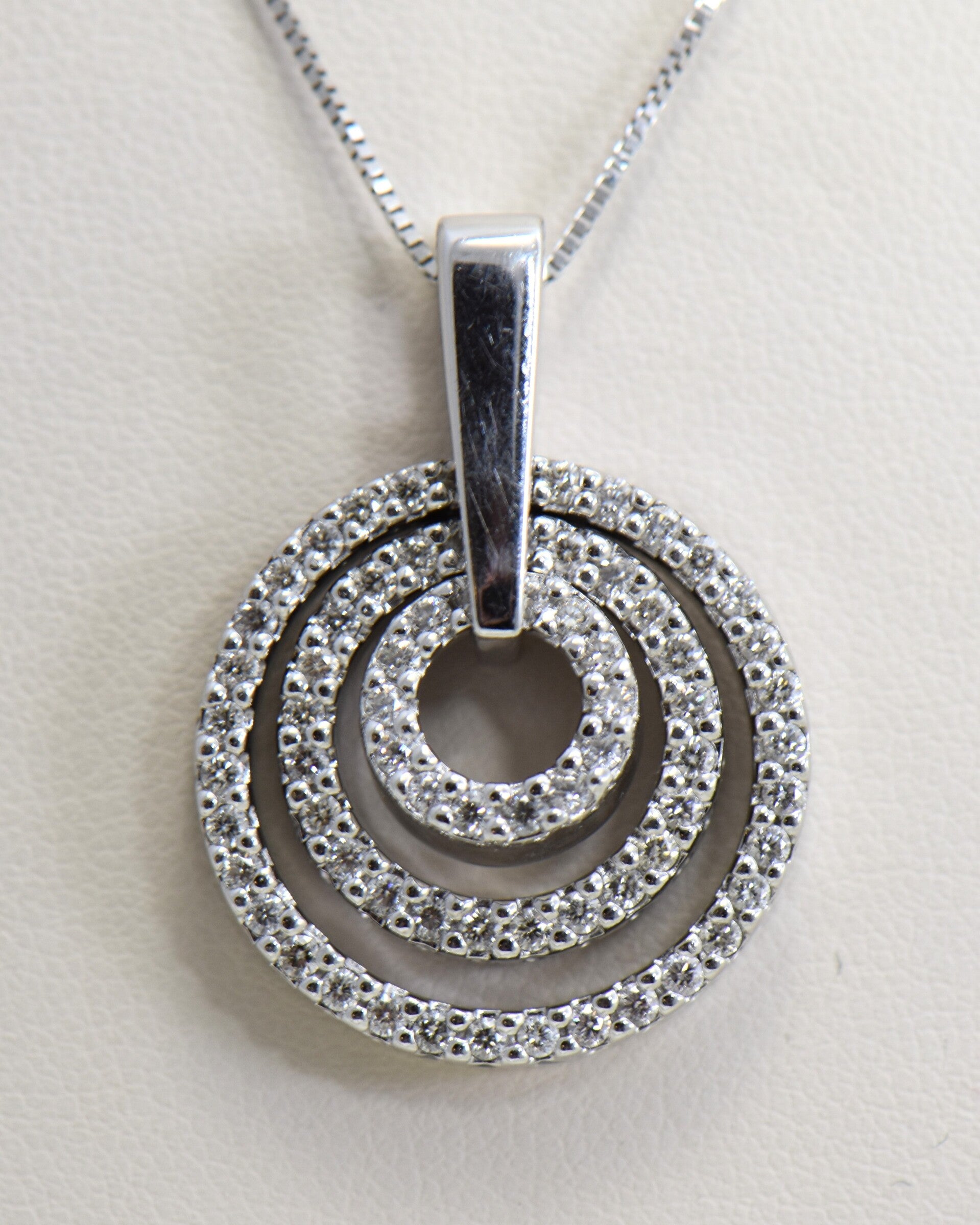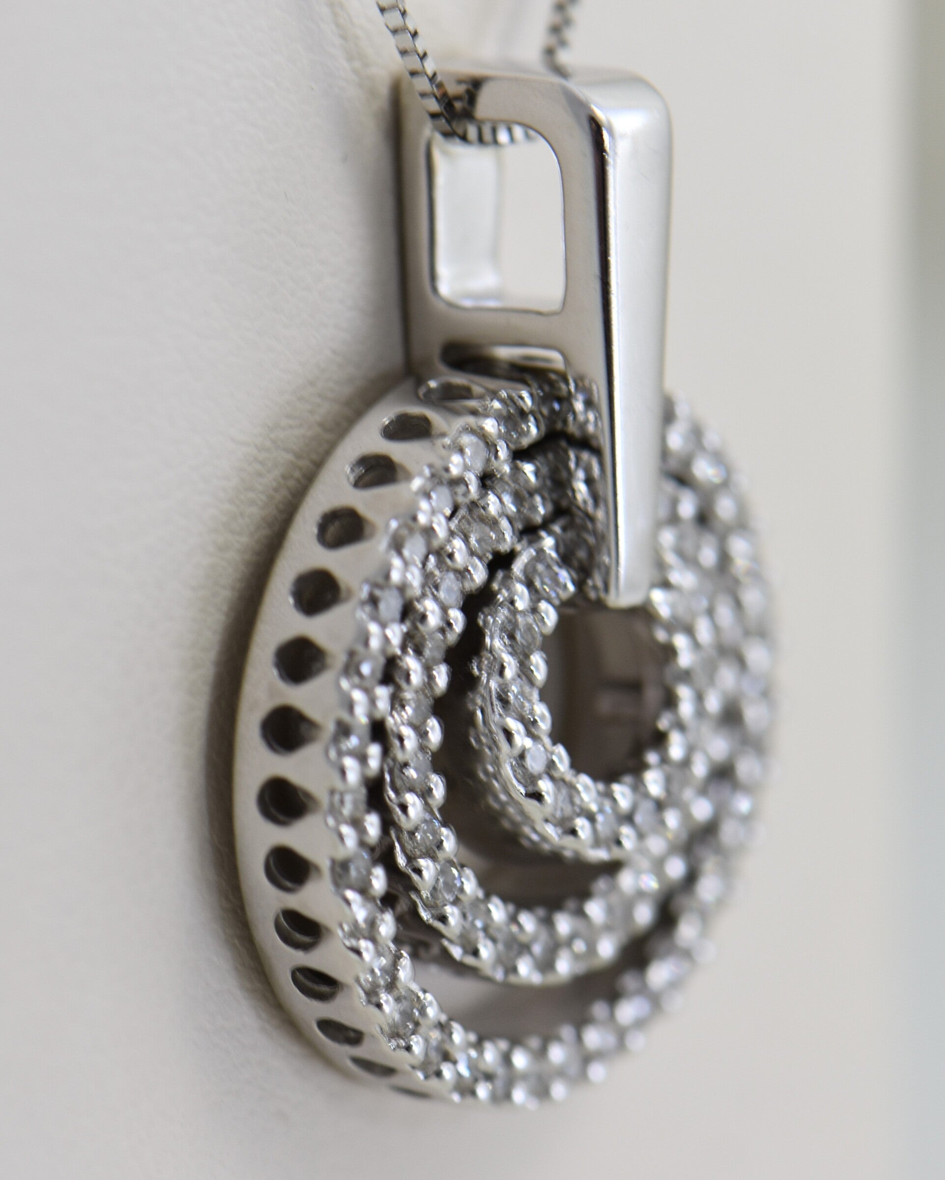 The diamond-set circle triplet contrasts beautifully with the tapered, unset bail, which is wide enough to accommodate almost any chain size. Measuring nearly 1.5 inches in length, this pendant is a true showstopper and would make the perfect romantic gift.