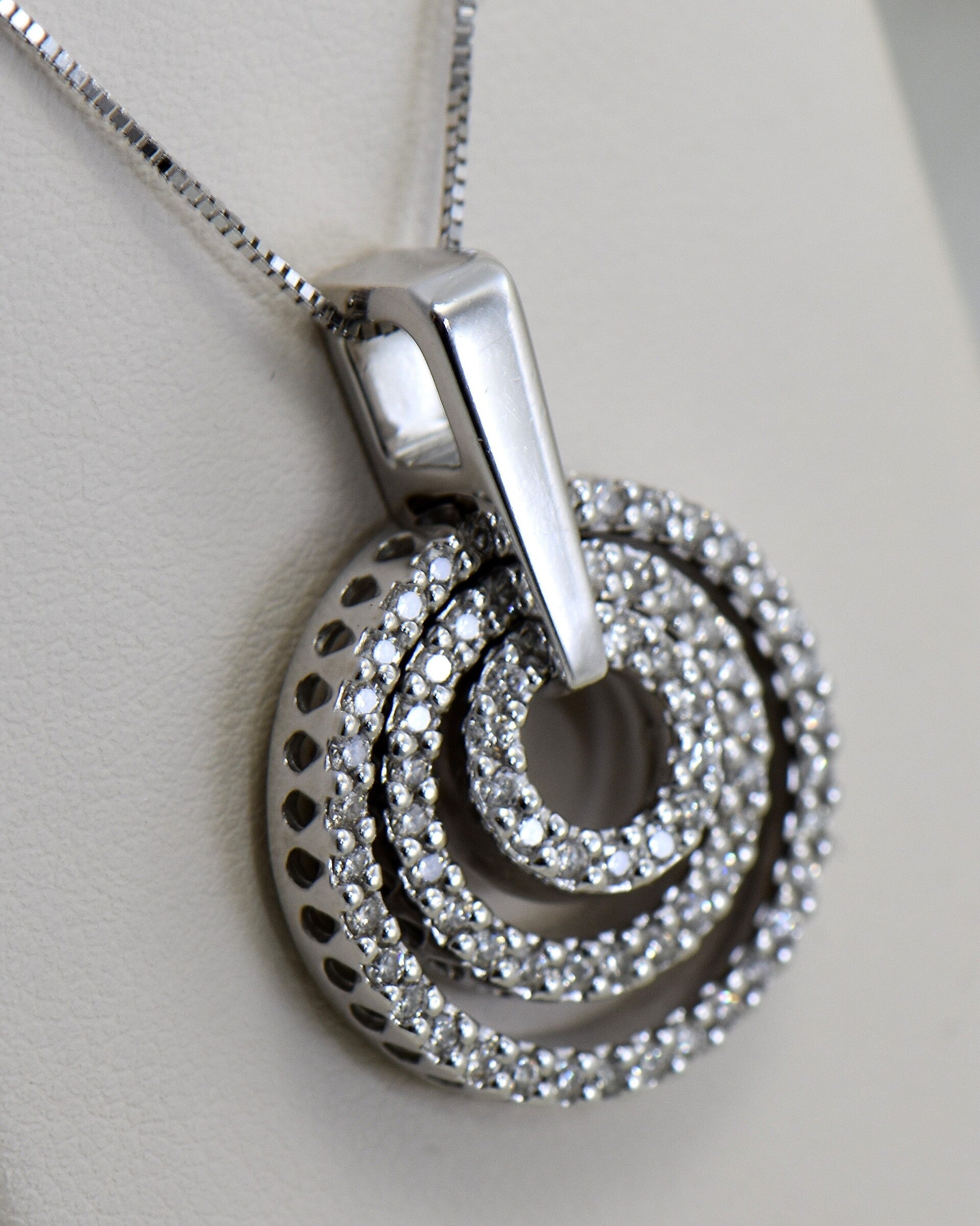 This pendant is crafted with great skill and high-quality materials. It has a solid construction and a substantial feel when worn, offering a comforting presence around the neck. Each circle is made individually and linked together with a standard bail, allowing them to move fluidly and spin concentrically, which creates a stunning sparkle.