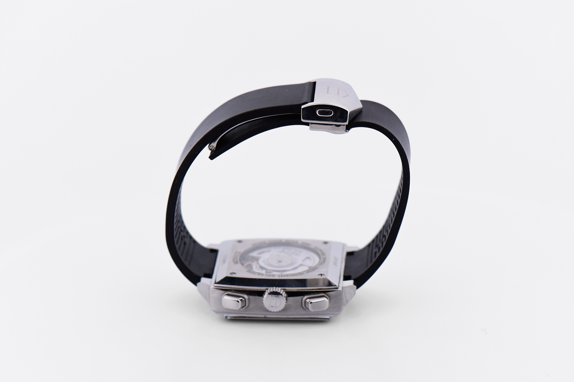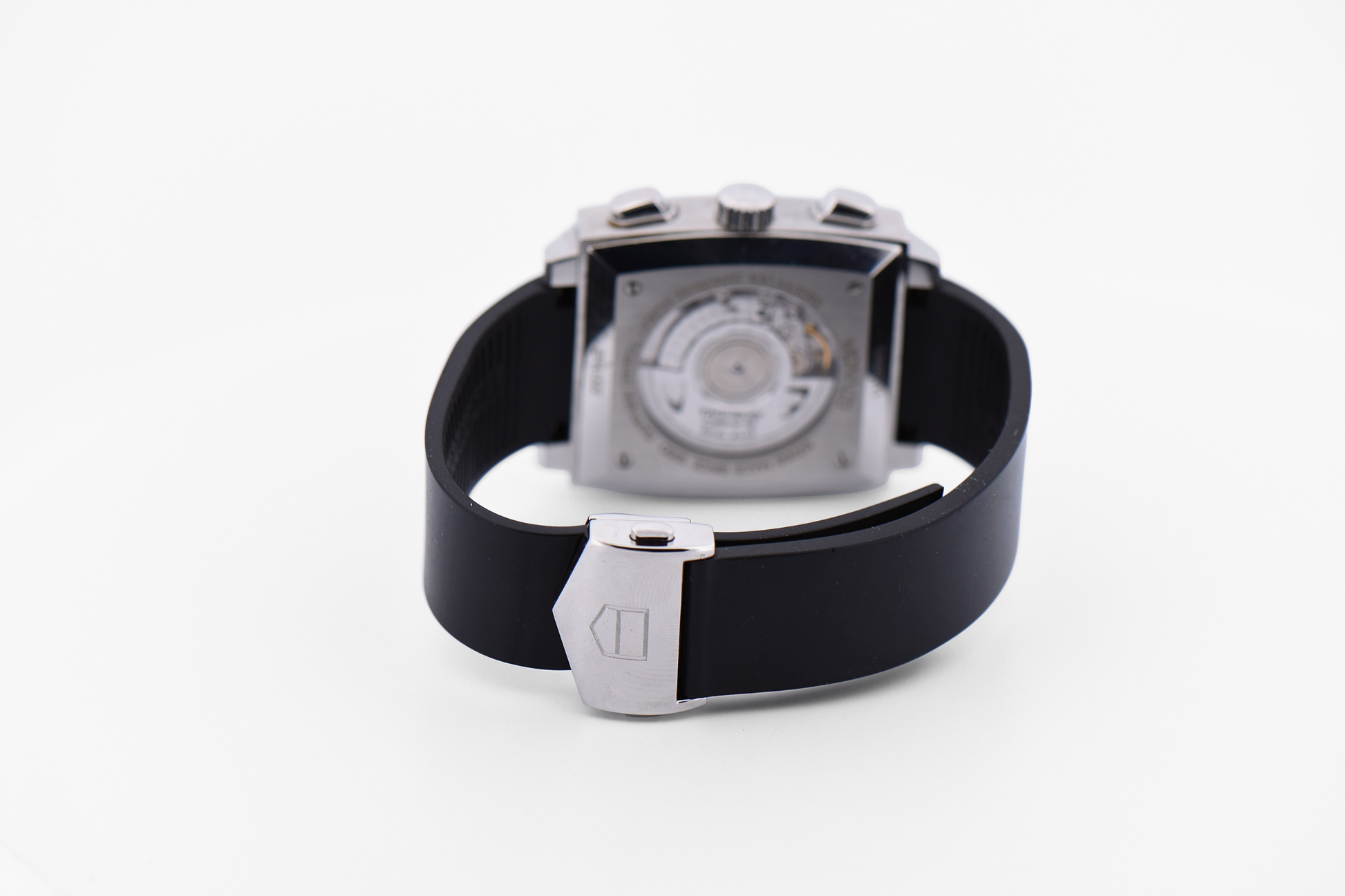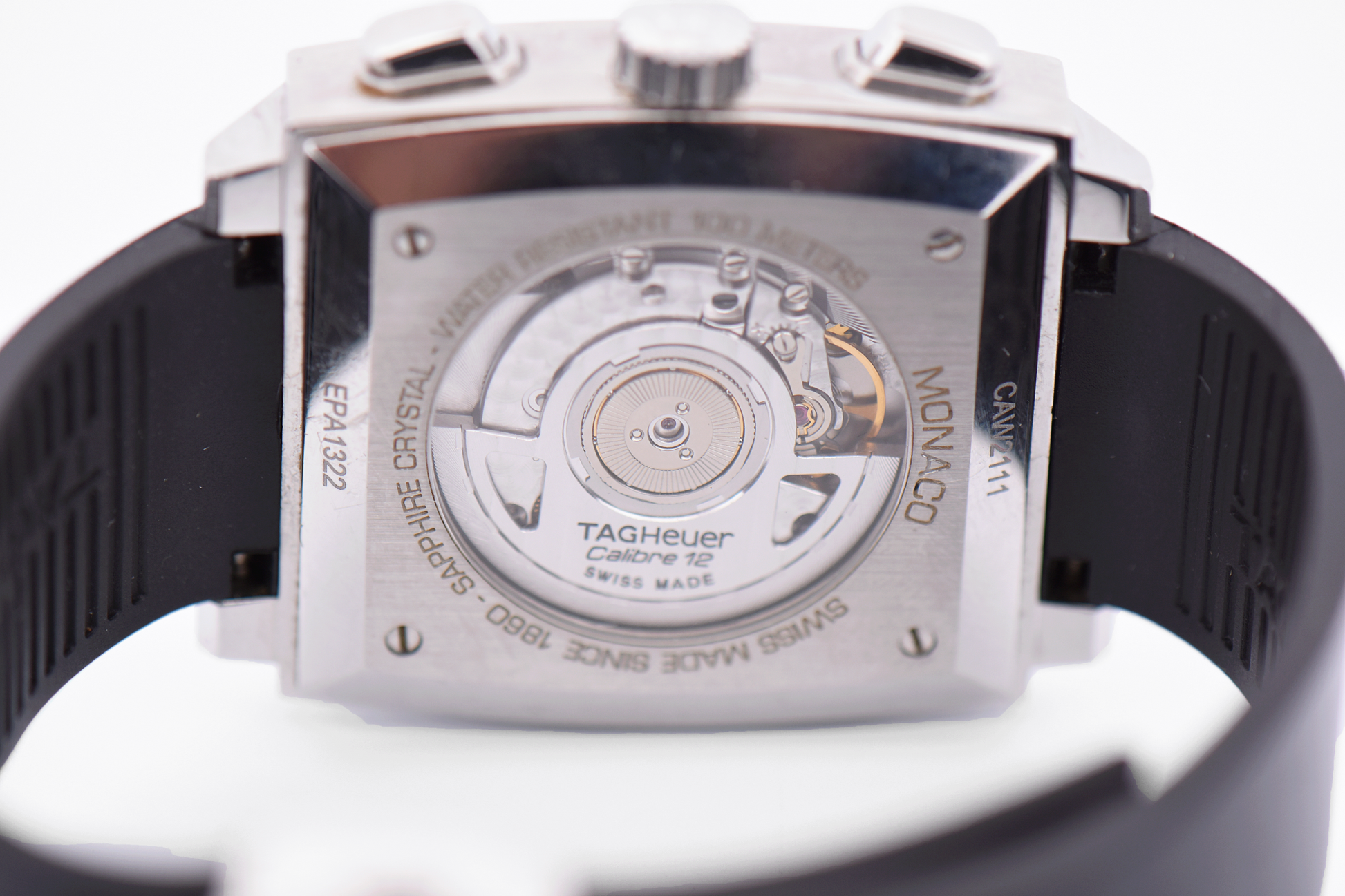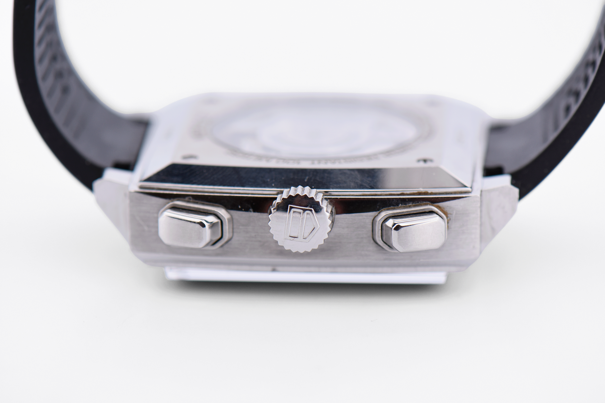 Powered by the Calibre 12 automatic movement, the watch delivers reliable chronograph functionality with a smooth, precise feel. The polished stainless steel case frames the dial with clean, angular lines, while the rubber strap adds a modern, comfortable edge suited for everyday wear.