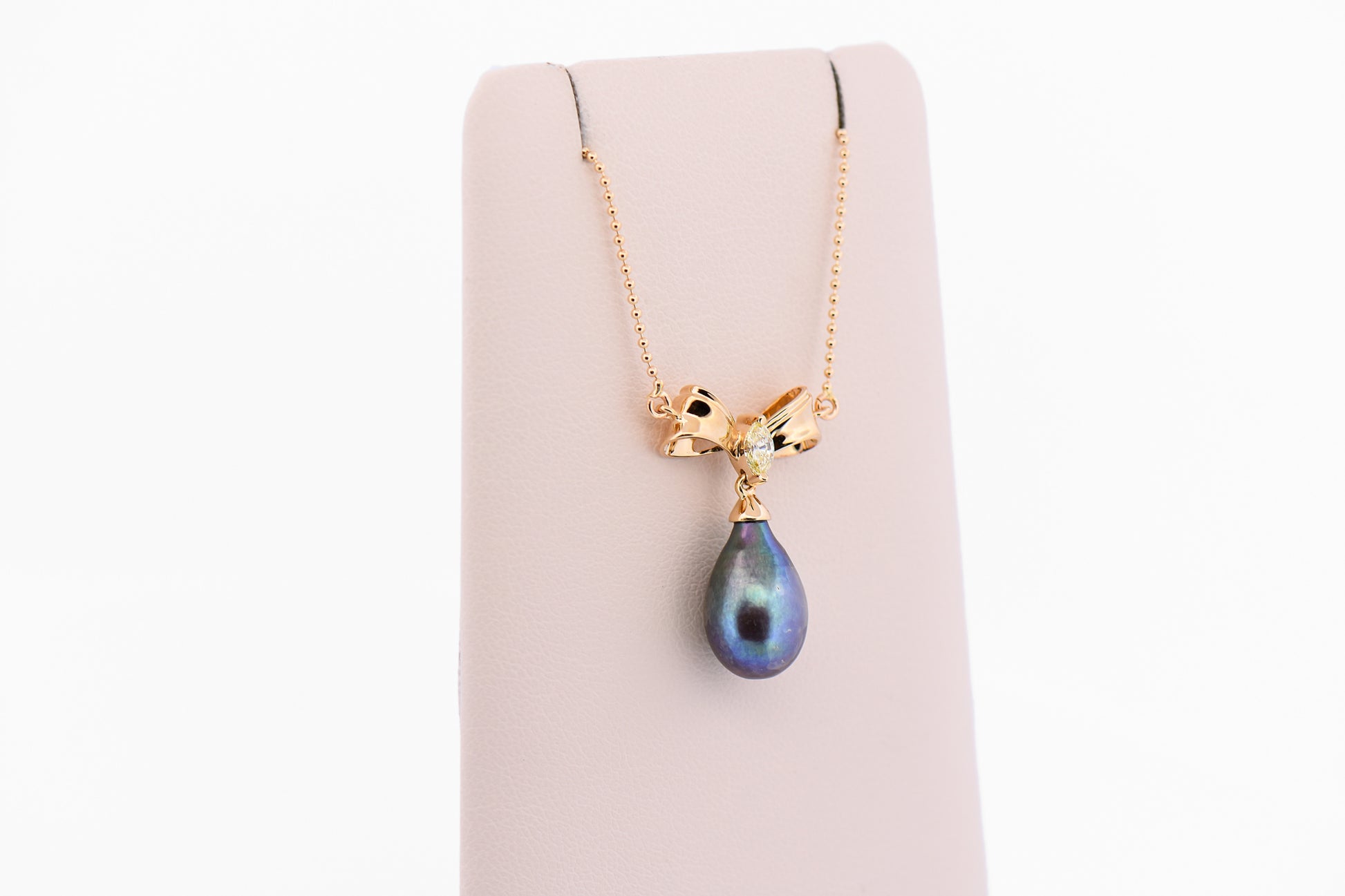 Graceful and distinctive, this bow-inspired necklace showcases the luminous beauty of a Tahitian pearl paired with warm yellow gold and sparkling diamond accents. The sculpted bow motif sits delicately along the chain, adding a playful yet elegant touch that draws the eye to the pendant below.
