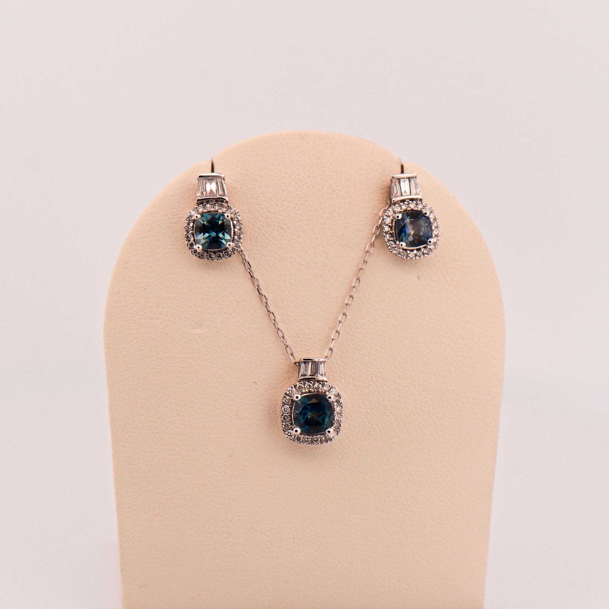 This beautiful jewelry set is designed to showcase stunning Montana sapphires at an affordable price. Known for their superior hardness and exquisite neutral color, teal Montana sapphires make excellent choices for engagement rings, and this coordinating pendant and earring set complements that style perfectly.