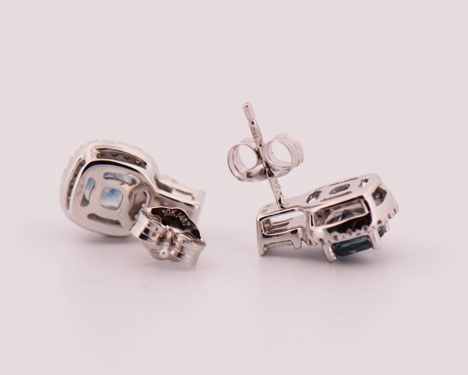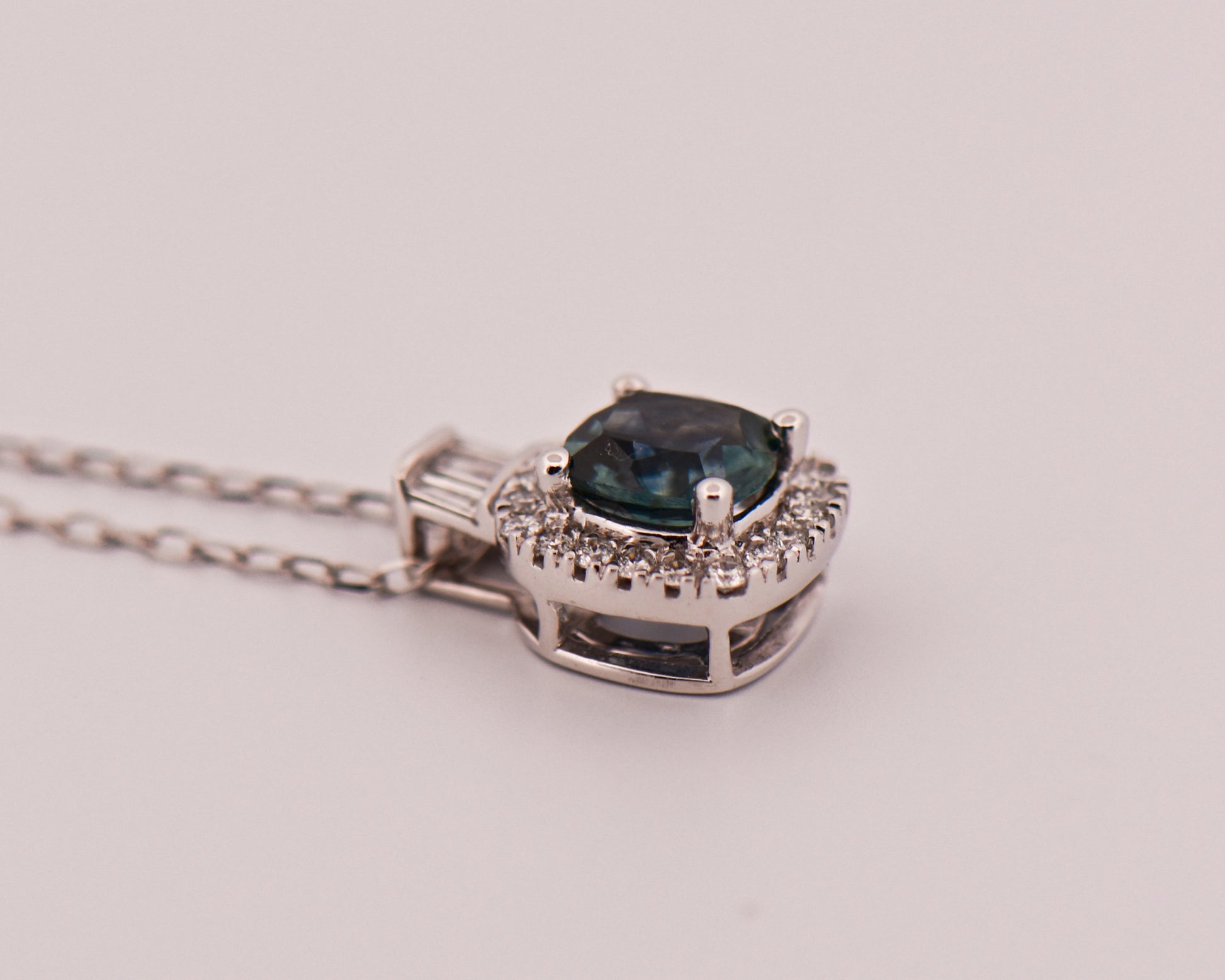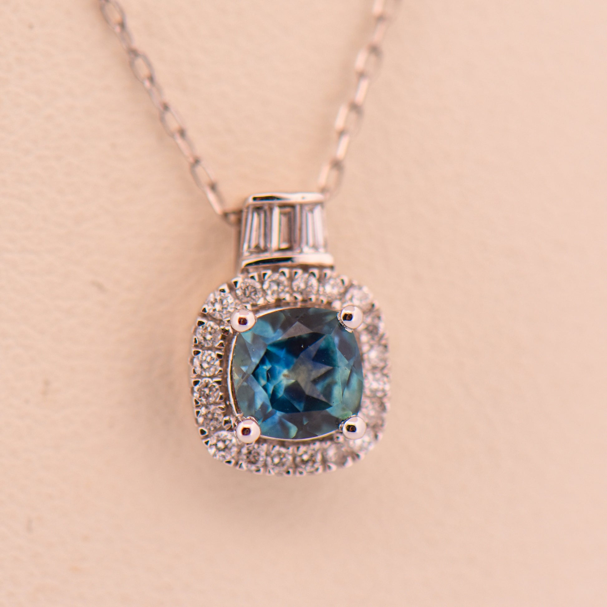 Details: Custom pendant and earring set in 10k white gold, featuring 2.10ctw of square cushion sapphires (teal, heat-treated, Missouri River, MT, USA) and 0.50ctw of natural diamond accents (SI2 G-H).