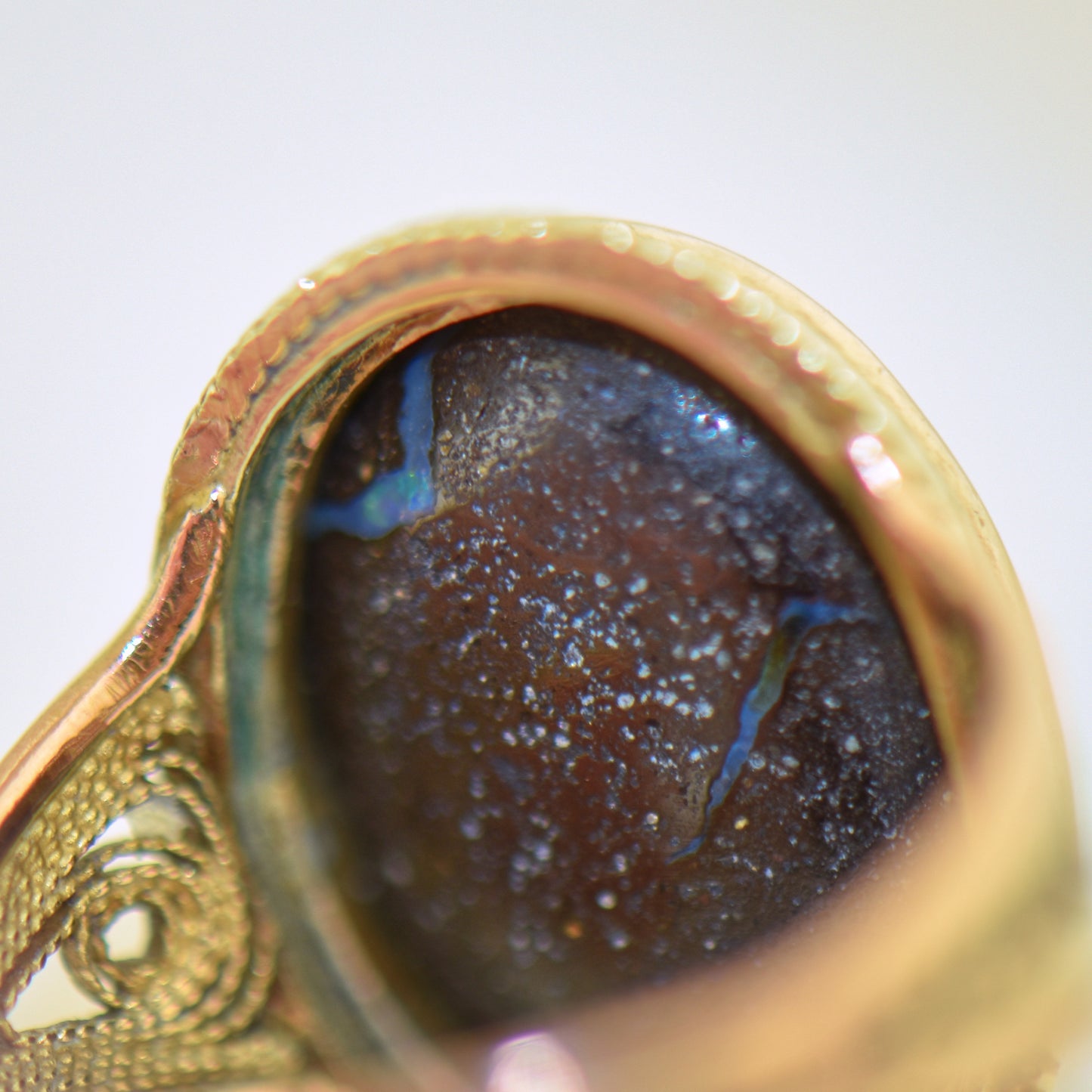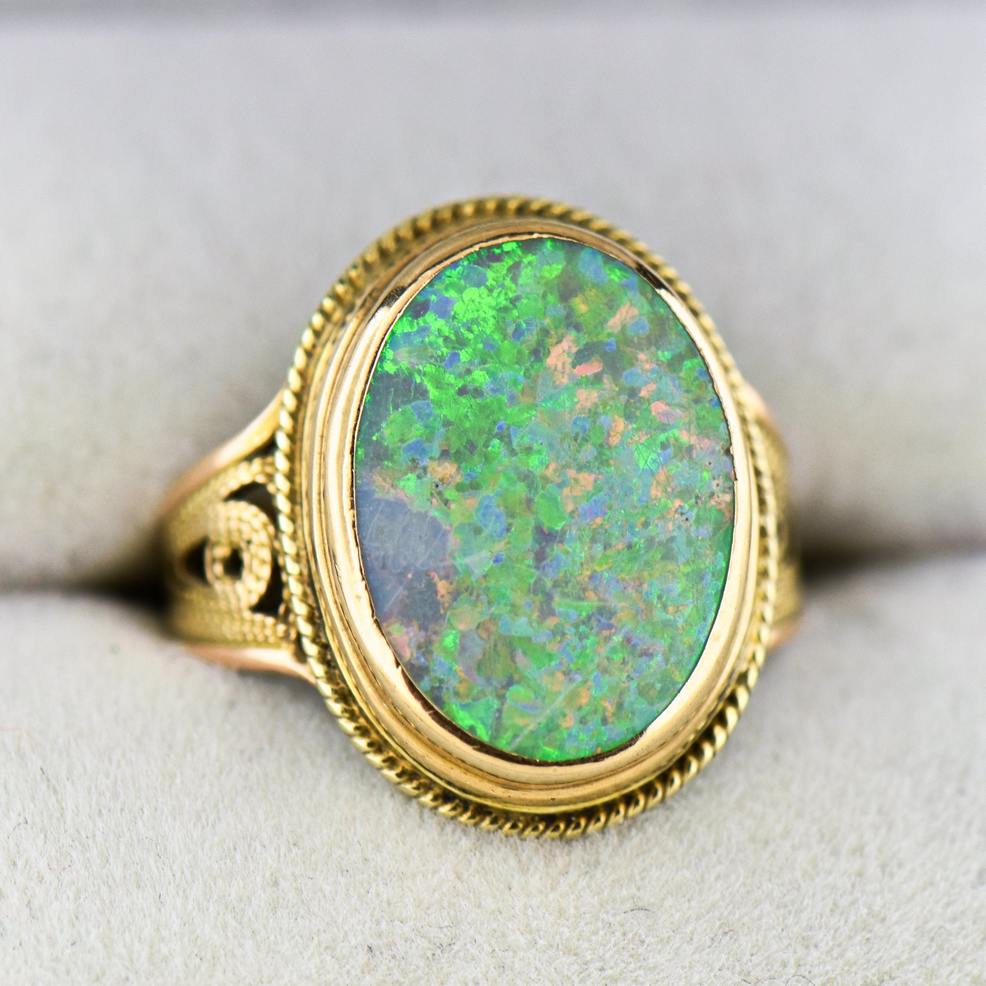 The opal features a unique chaff color pattern with vibrant green, orange, red, and blue hues, with green being the dominant color. The ring is designed as a bezel-set solitaire, but it is anything but ordinary. The bezel is enhanced with a rope pattern, while the shank incorporates gold wirework, known as cannetille, giving the ring a slightly filigree appearance. Although it is unmarked, the design clearly shows an Italian influence.