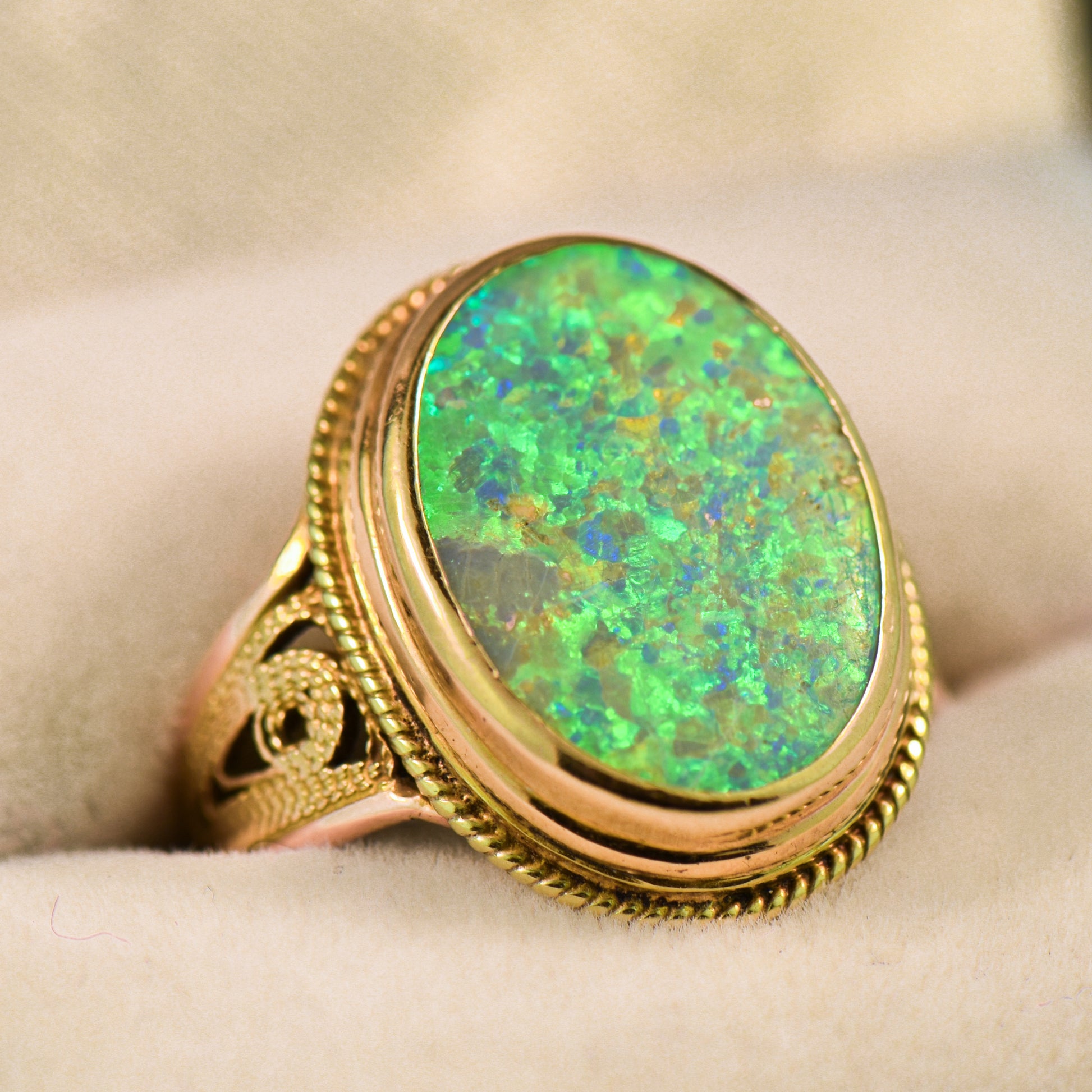 Details: 14k yellow gold vintage solitaire ring featuring a 4ct solid Australian boulder opal with a vibrant green-dominant chaff pattern, accented by a rope bezel and intricate cannetille wirework, circa 1960s.