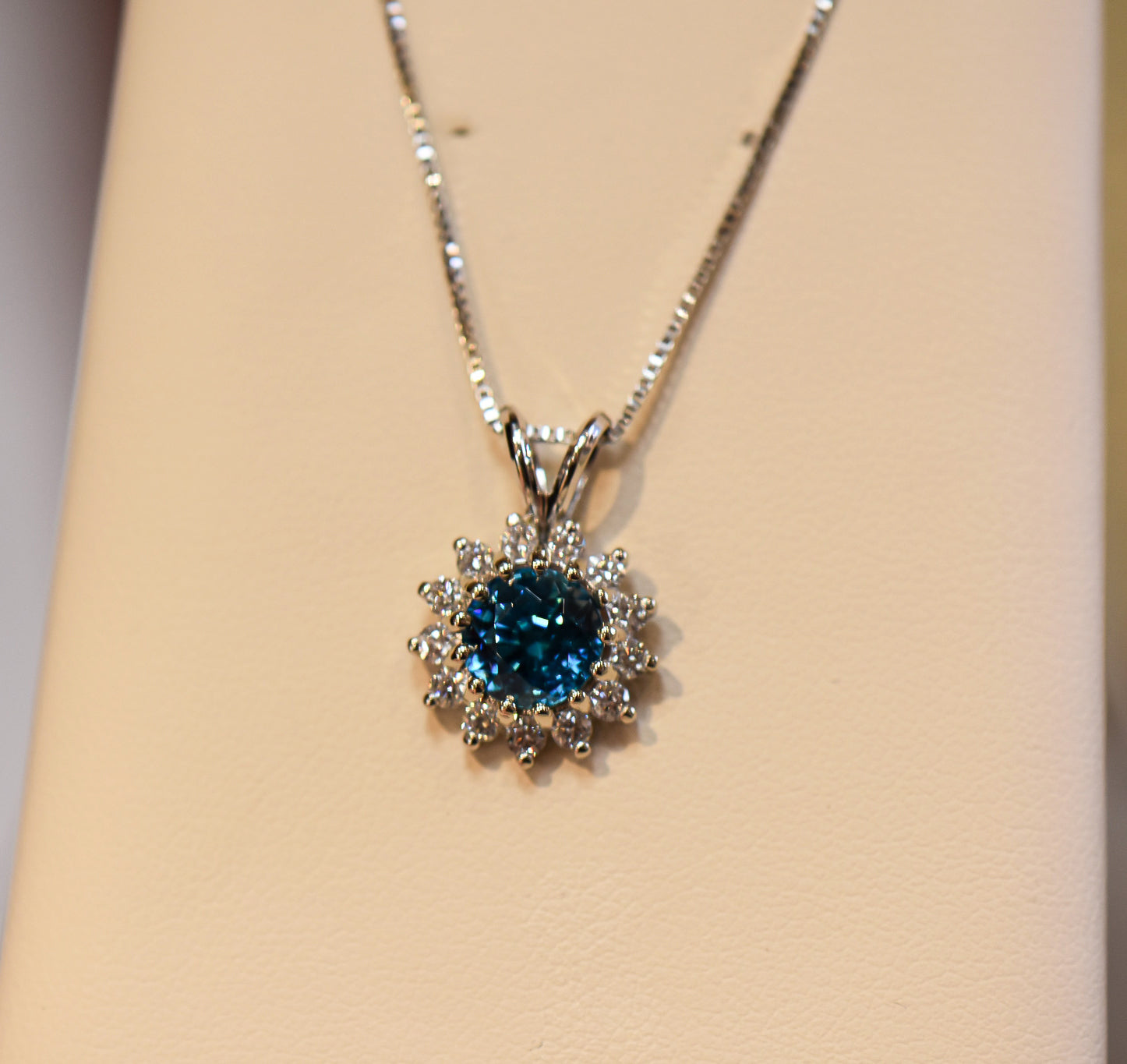 Make a luminous statement with this exceptional blue zircon pendant, a dazzling design that celebrates one of the most vibrant gemstones in the world. Set in bright 14k white gold, the pendant showcases a superb 2.46ct round blue zircon whose vivid teal hue and remarkable brilliance create an almost electric glow. Known for its extraordinary fire, this gemstone radiates flashes of light with every movement.