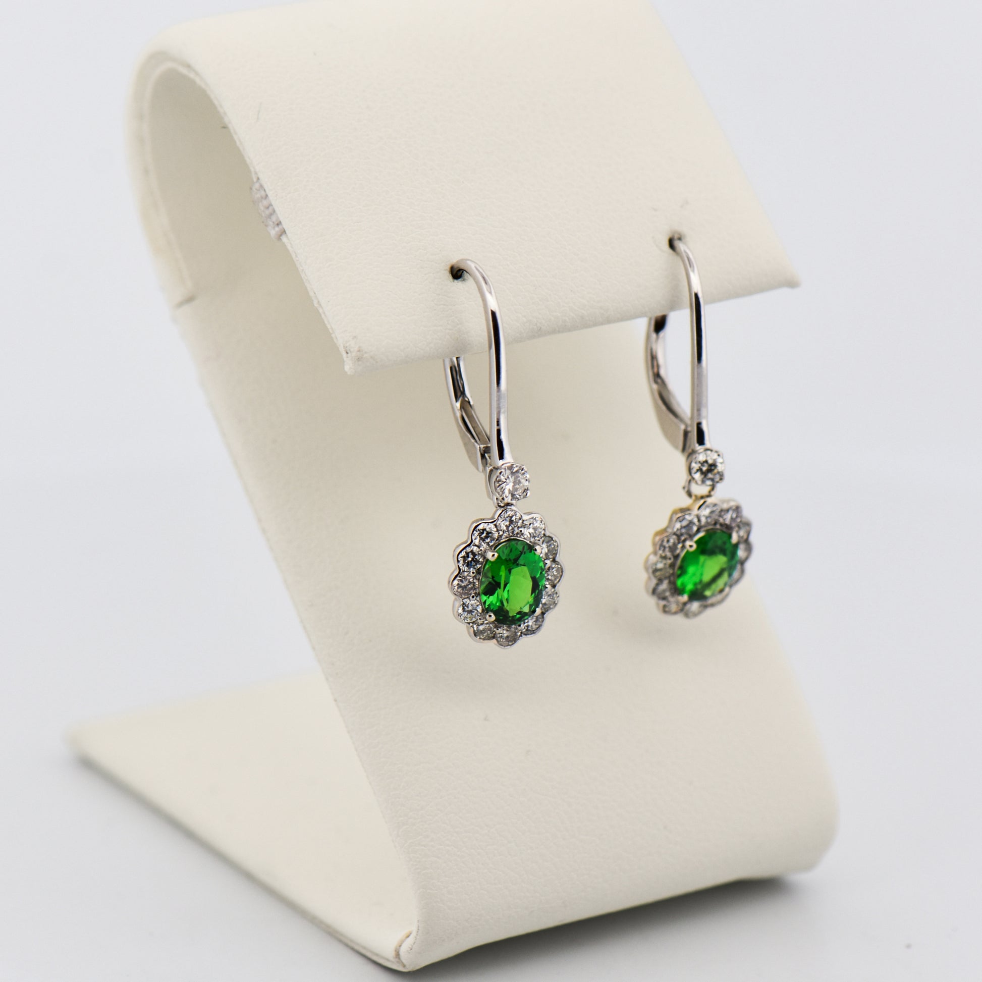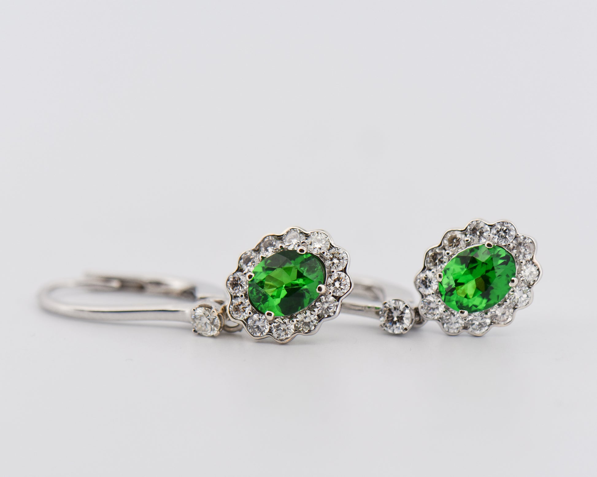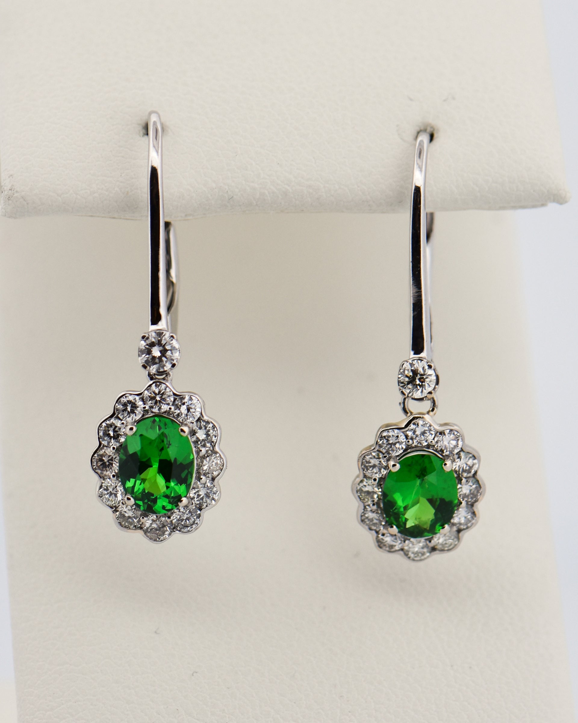 Details: custom 14k white gold lever-back earrings set with 1.44ctw oval tsavorite (Kenya, untreated, 7x5mm) and .87ctw round natural diamond accents (SI-I1 GH).