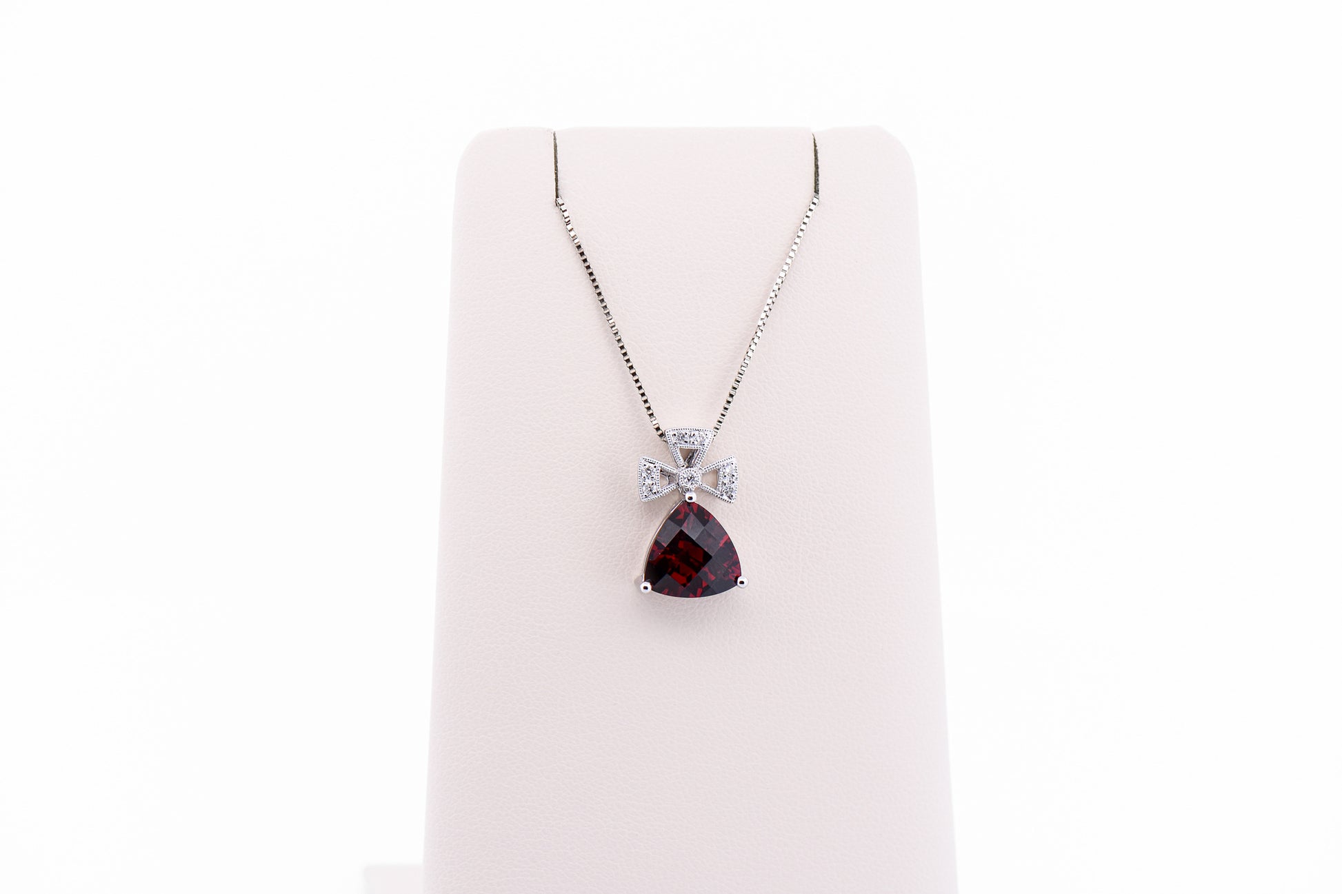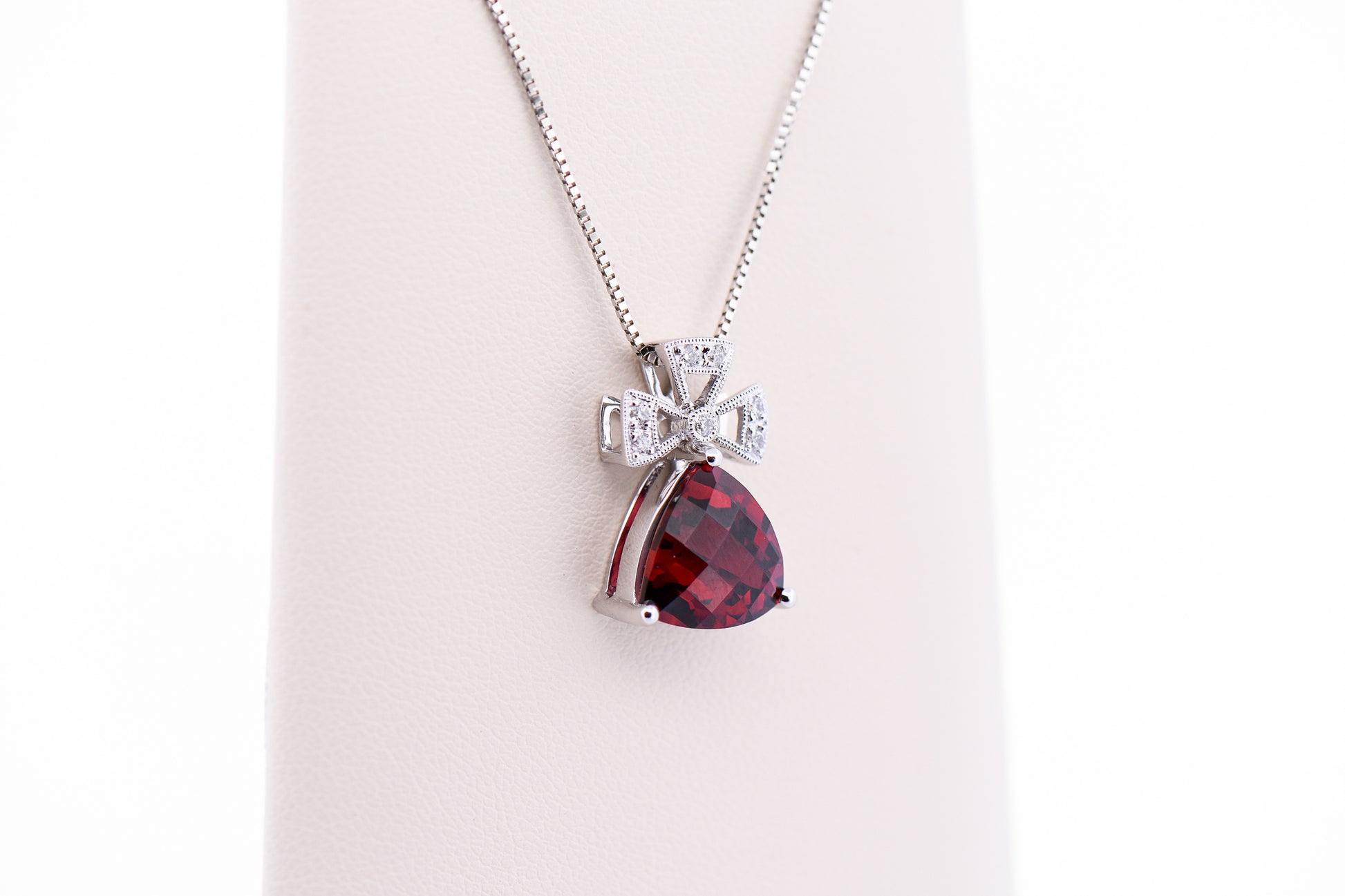 Details: Garnet pendant in 14k white gold featuring a trillion-cut red garnet weighing approximately 4.78ct and approx. 0.05ctw diamonds (SI clarity, G–H color).