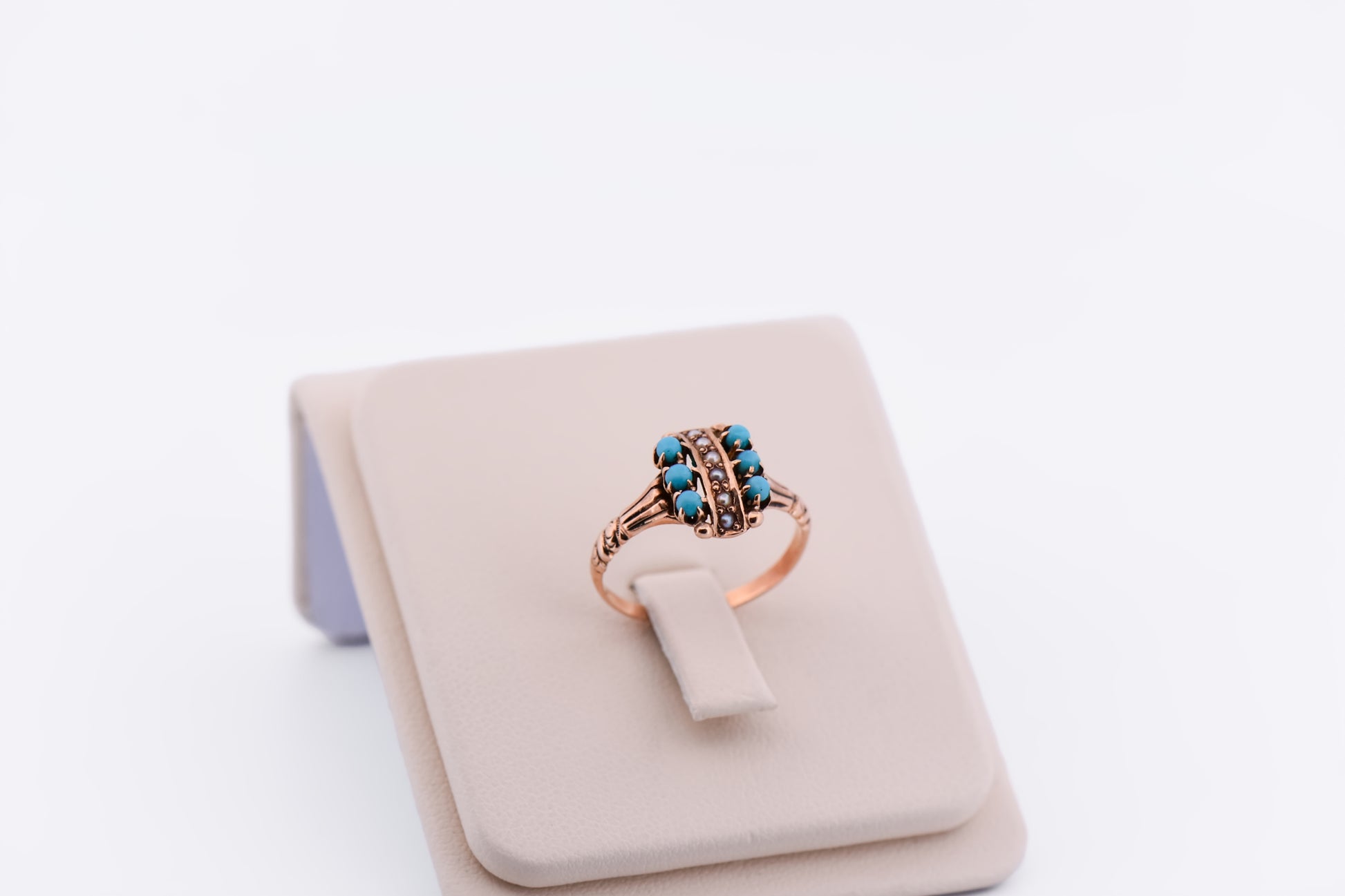 Details: Victorian 9k rose gold ring with pearls and turquoise; 2g; circa 1890.