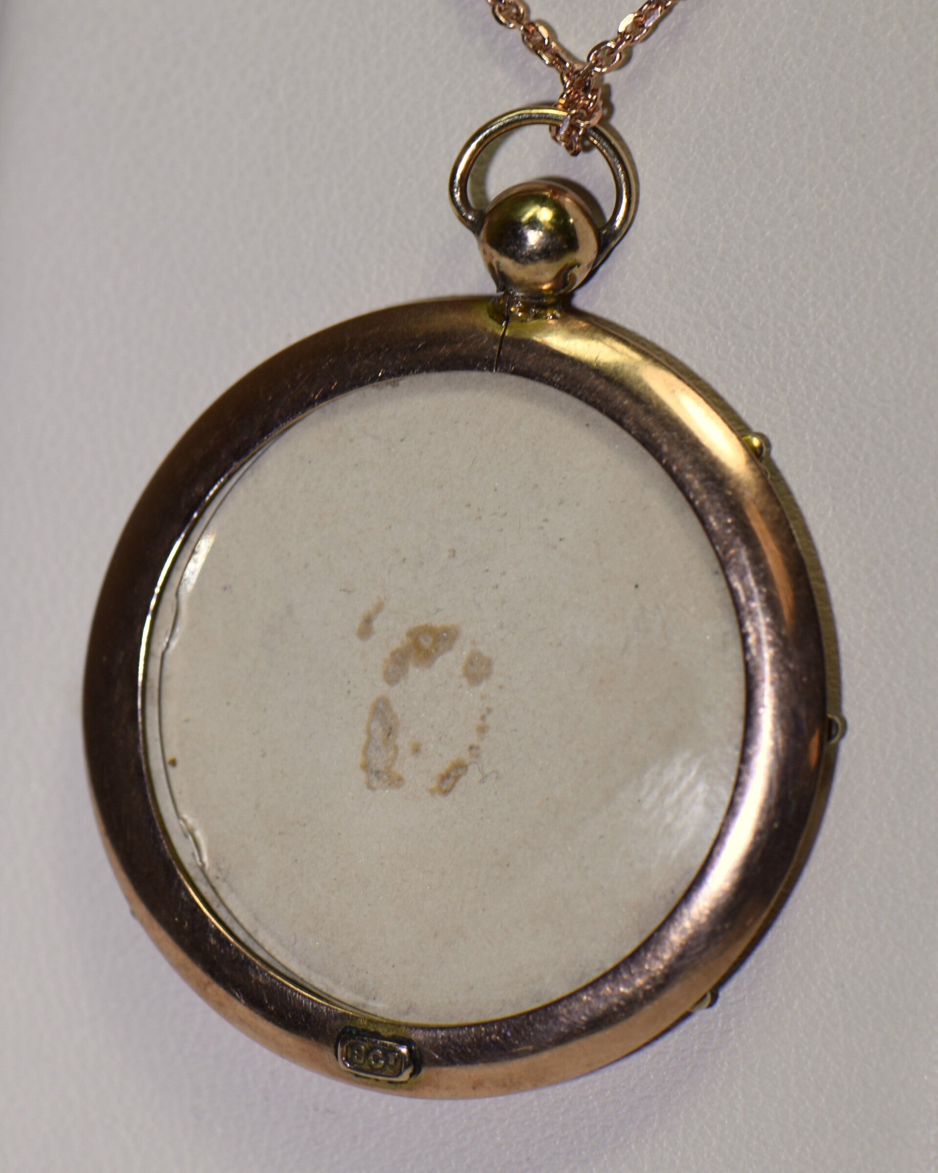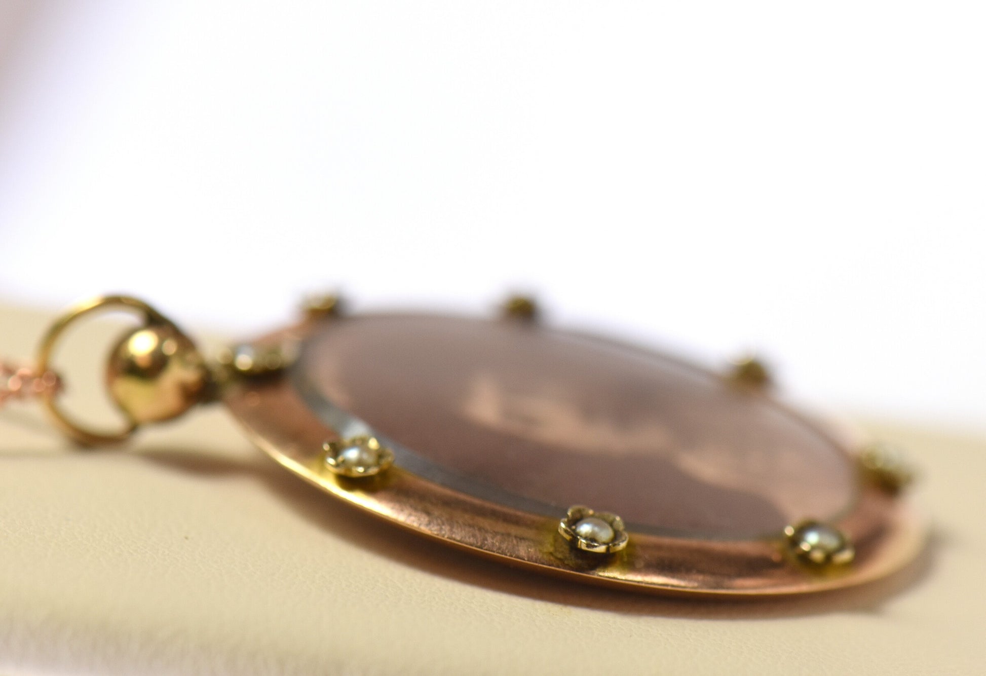 Details: 9k rose gold and yellow gold antique locket with seed pearl accents and acrylic frames, circa 1895, British.