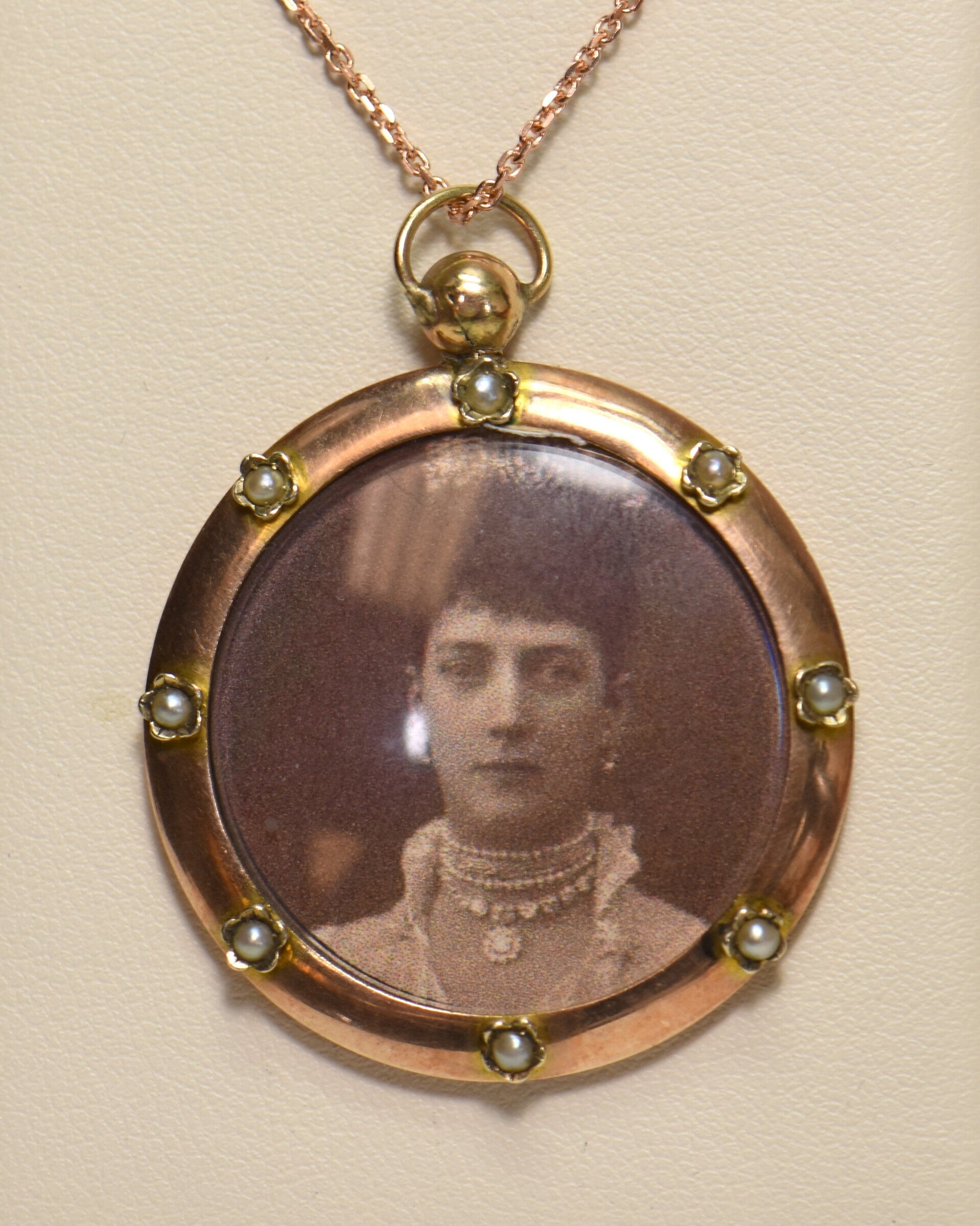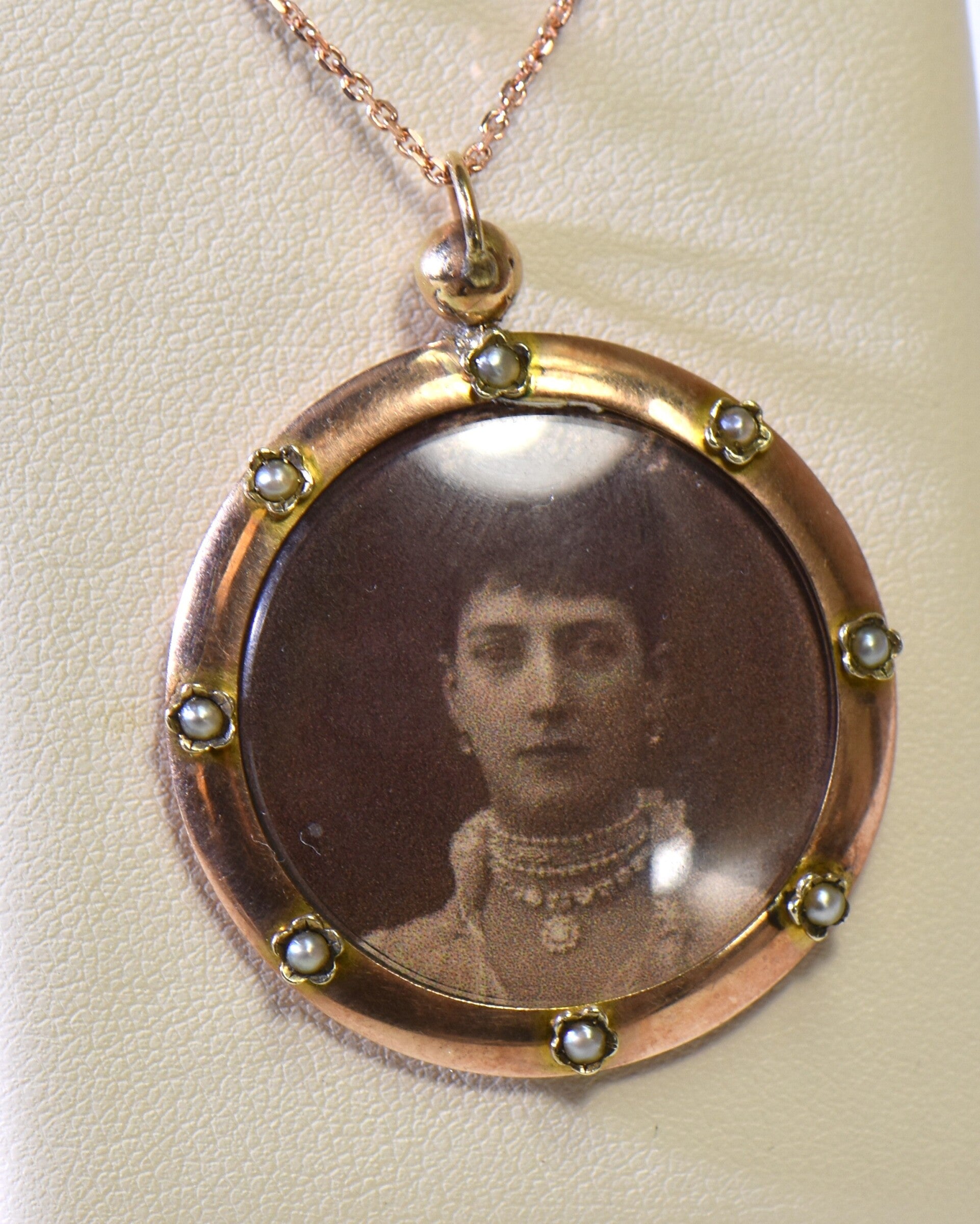 Few late Victorian lockets are as fine, or as easy to wear, as this rose gold beauty, crafted in England around 1895. The frame is made of 9k gold, adorned with delicate yellow gold flowers, each set with a seed pearl. The bail at the top of the pendant unscrews, allowing the frame to open easily. Inside, the owner can place photographs or locks of hair on both sides, as it is reversible. Currently, it holds an elegant, modern photo of Queen Alexandra, the wife of King Edward, serving as a temporary placeholder until the next owner can insert their cherished image.