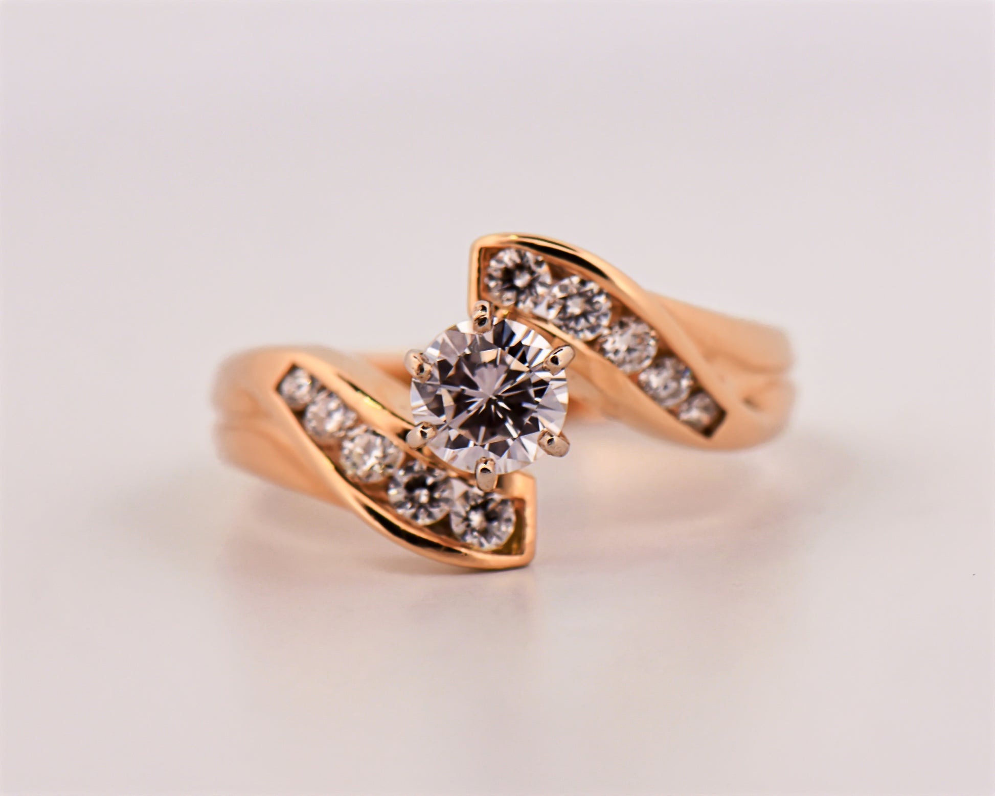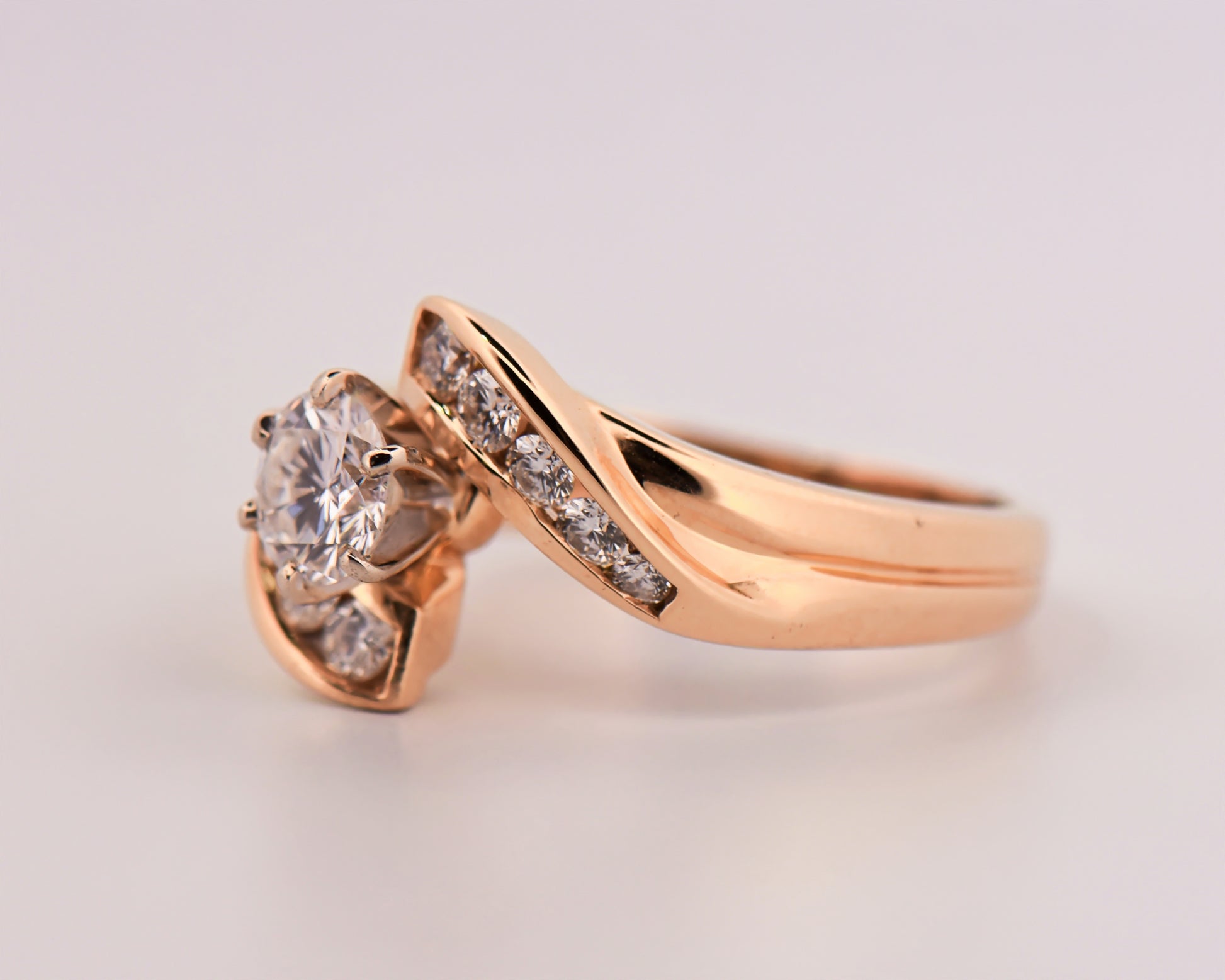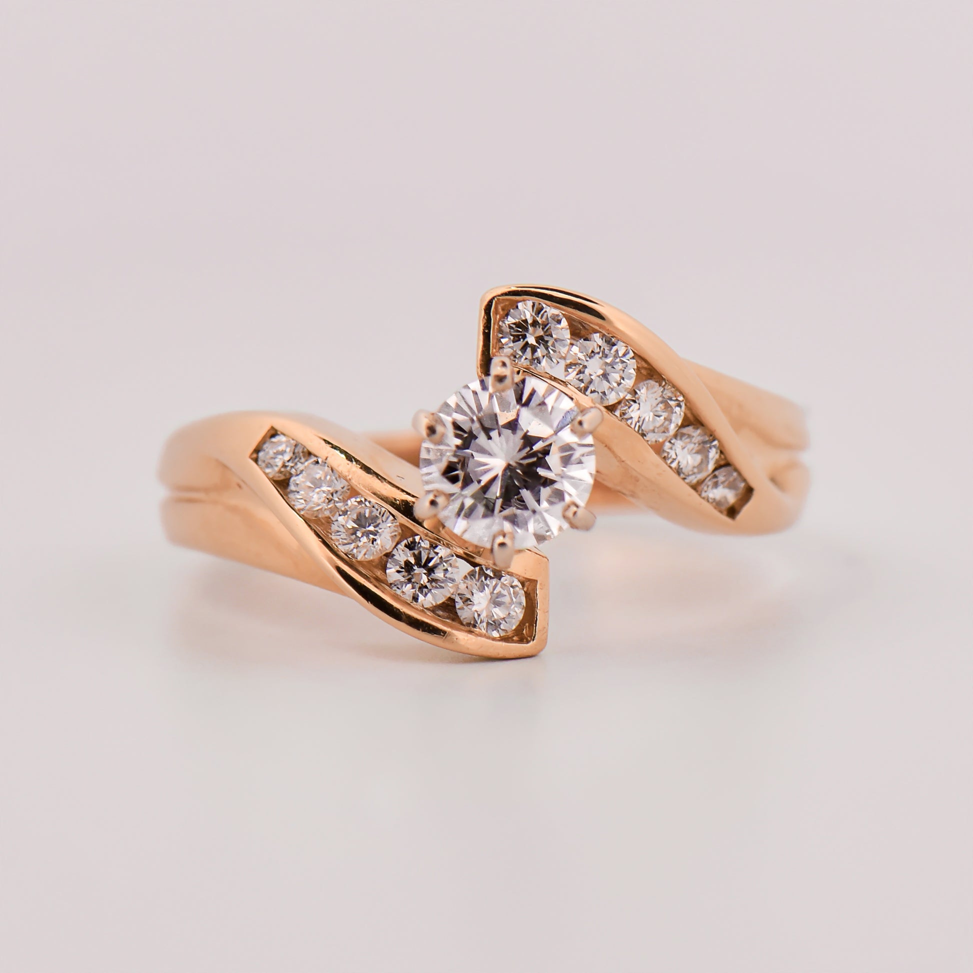 Graceful and full of character, this vintage diamond ring blends sophistication with timeless appeal. Crafted in glowing 14k yellow gold, it features a dazzling 0.80-carat center diamond, wrapped in a sweeping bypass design adorned with glittering accent stones that enhance its brilliance and movement.