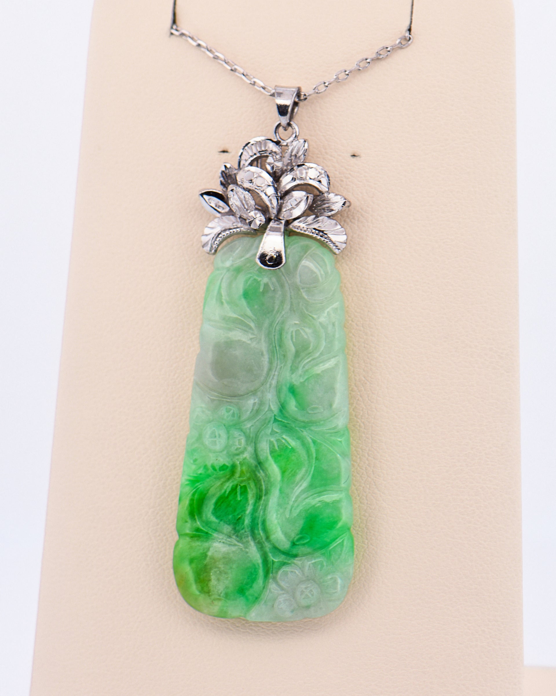 Details: Vintage carved jadeite jade tablet pendant in 18k white gold featuring rich green hue and floral motif accent; measures approx. 2 inches in length; estate piece, circa 1960.