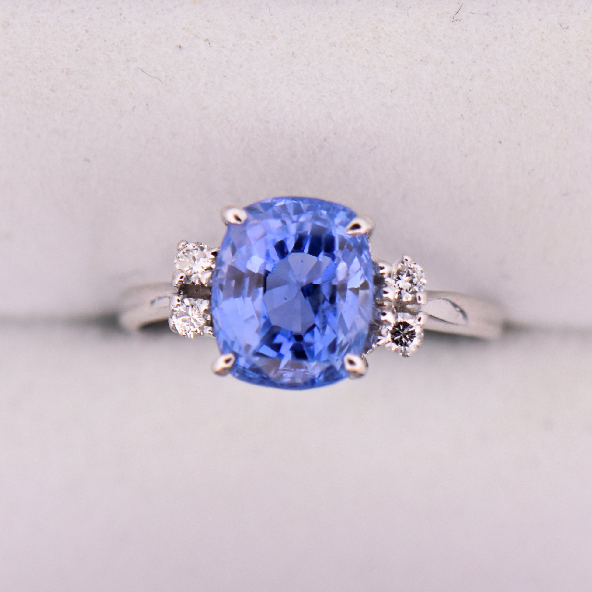 Details: Mid-century 14k white gold ring featuring a 3.50ct cushion-cut blue sapphire (Sri Lanka, untreated, cornflower color) and .12ct of round diamond accents (SI2 GH), circa 1950s.