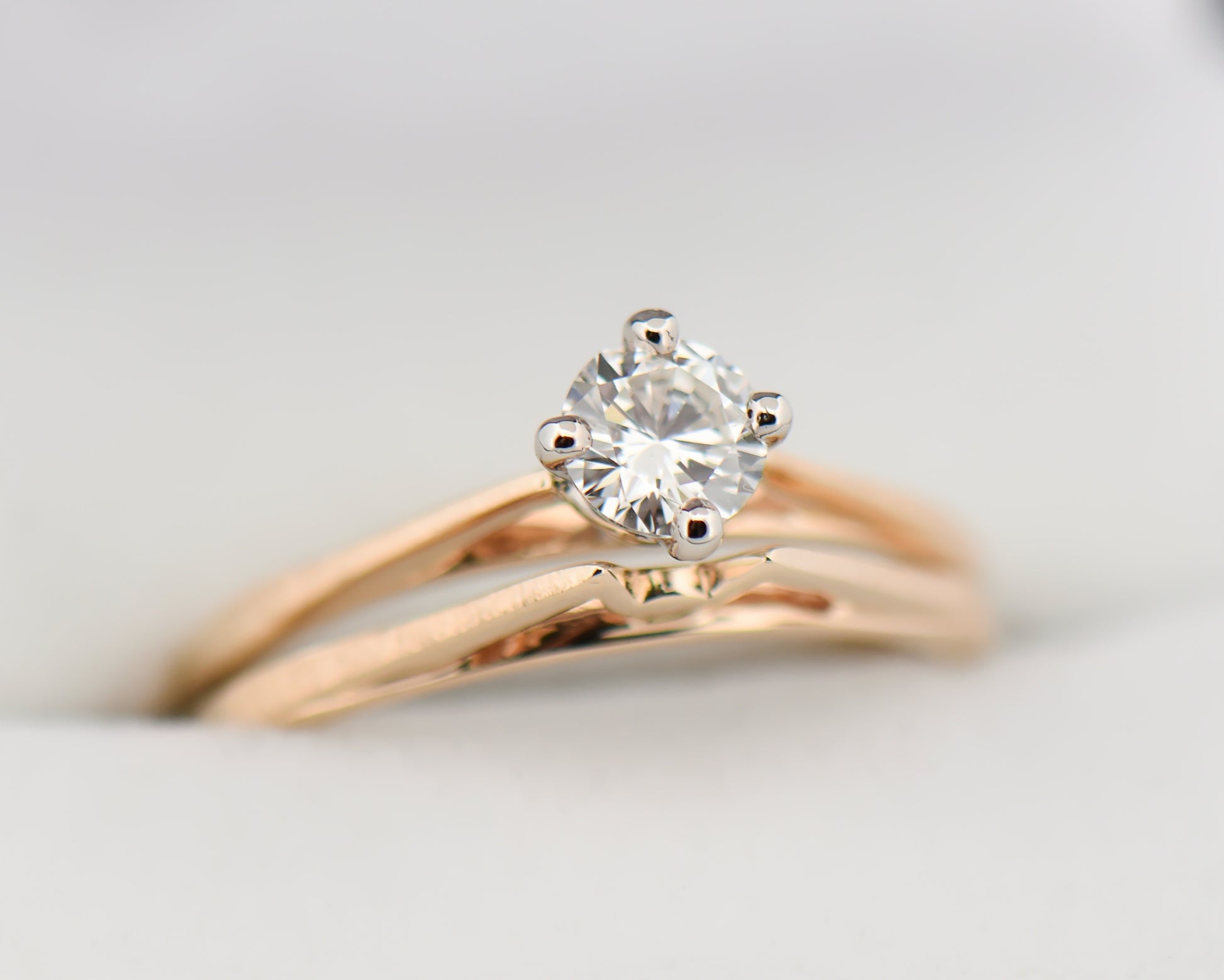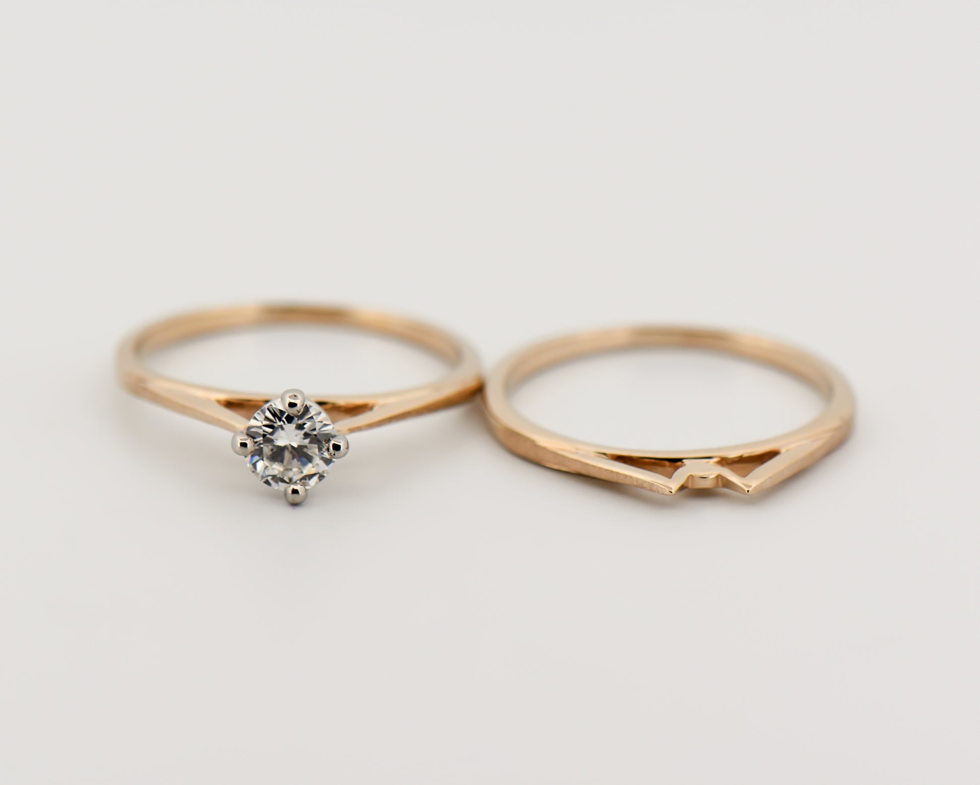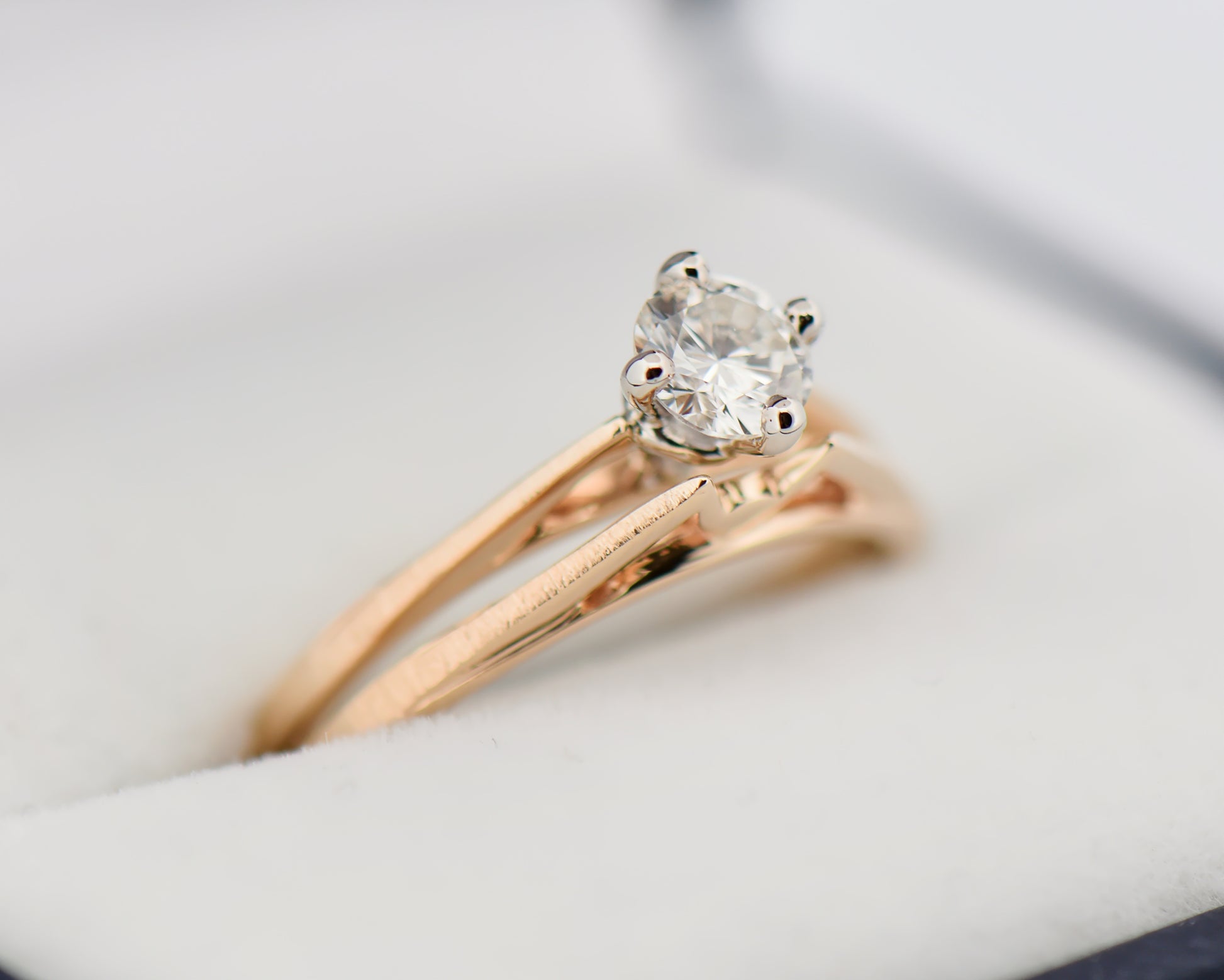 Details: Vintage diamond wedding set in 14k yellow gold with white gold prongs featuring approx. 0.37ct round brilliant diamond (VS1 clarity, G color); circa 1960; estate piece.