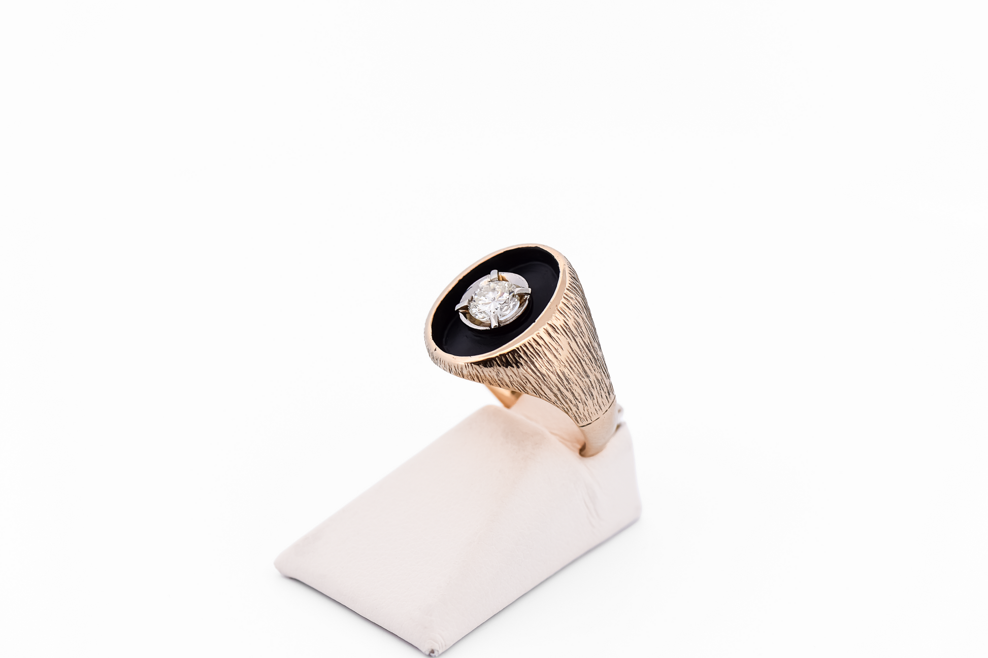 Bold and distinctive, this vintage gentleman’s ring showcases a classic round brilliant diamond set within a striking oval field of black antiquing. The contrast between the bright center stone and the darkened surround creates a dramatic, high-impact look, drawing the eye directly to the diamond’s brilliance.
