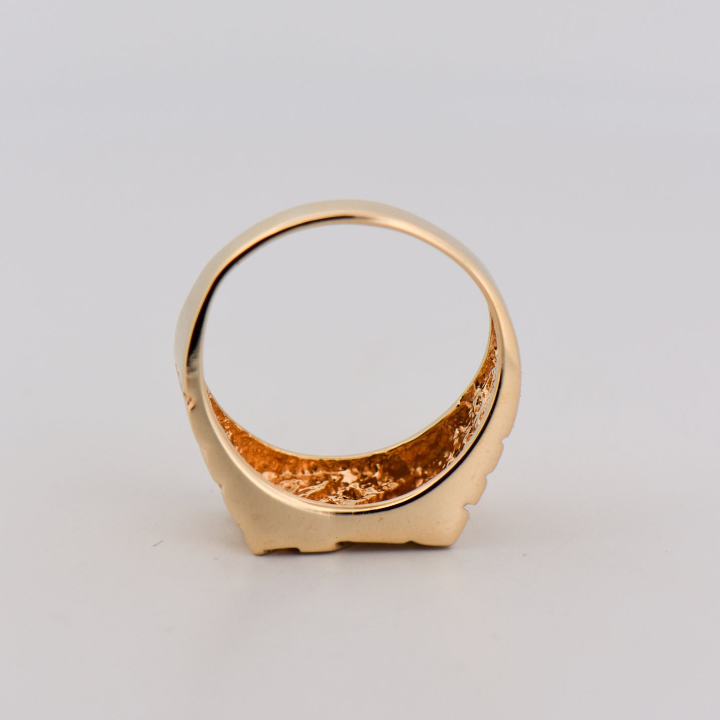 This vintage nugget ring is a highly sought-after item in today's market. Crafted in the late 1970s or early 1980s, this men's nugget ring features a poured design that resembles the appearance of gold nuggets, rather than being made from small gold nuggets. Many people prefer these poured nugget designs because they are made from 14k gold, which is more durable than 22k gold and allows for greater design flexibility.