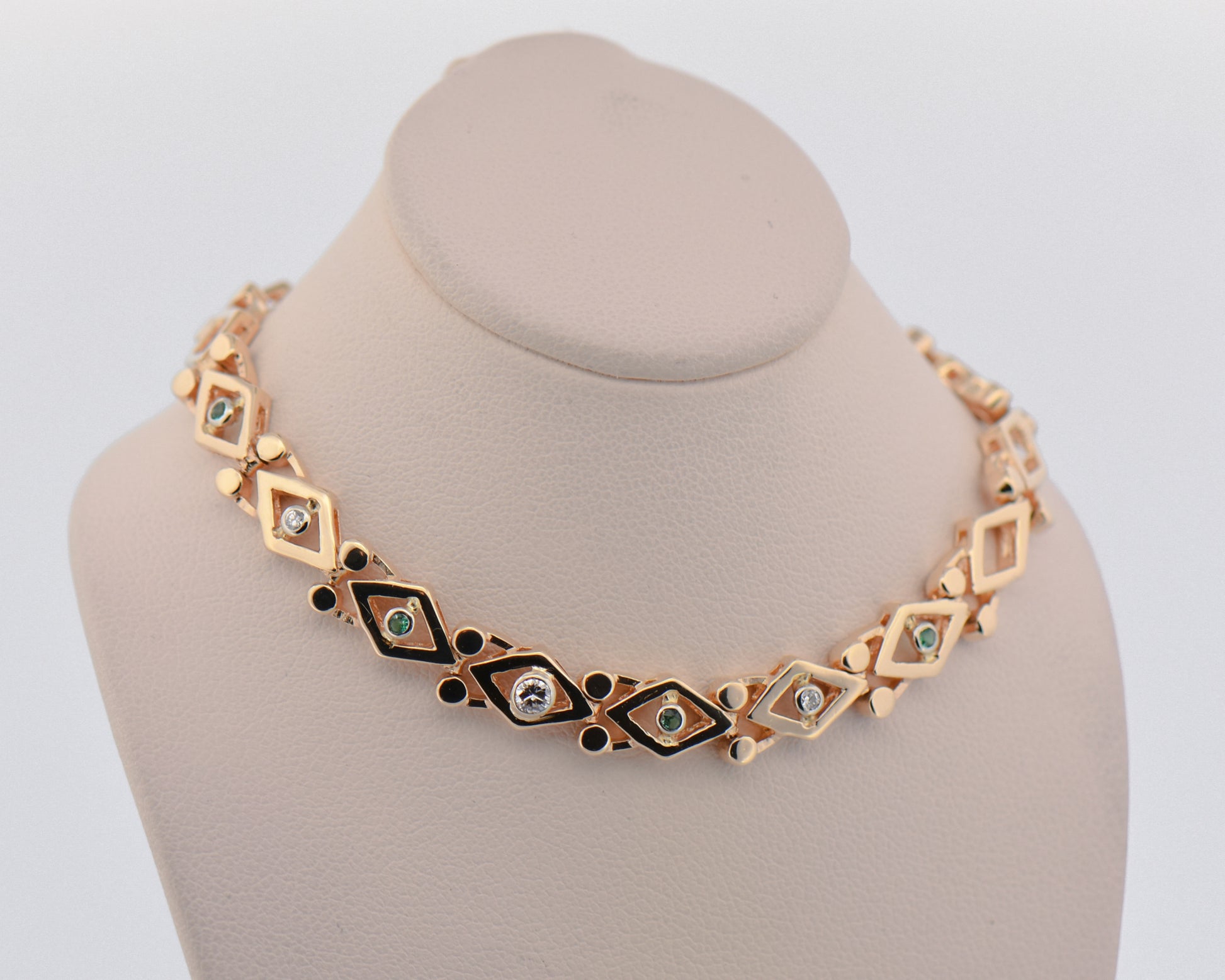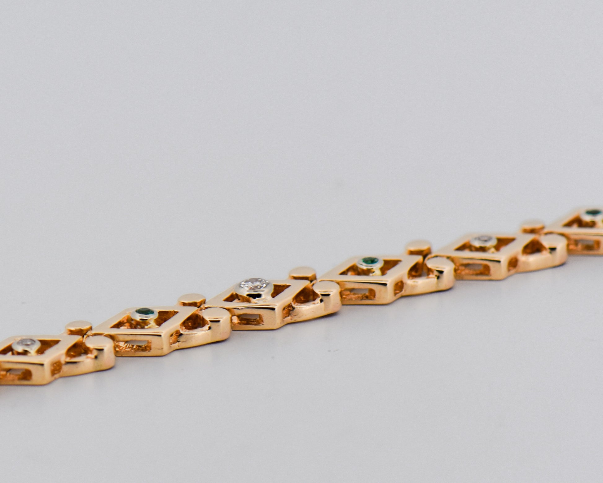 Details: Vintage 14k yellow gold geometric link bracelet set with .15 carats total weight of diamonds (SI GH) and .10 carats of round emeralds (natural, lightly abraded). Total weight: 15 grams. Made in Italy, circa 1970s.