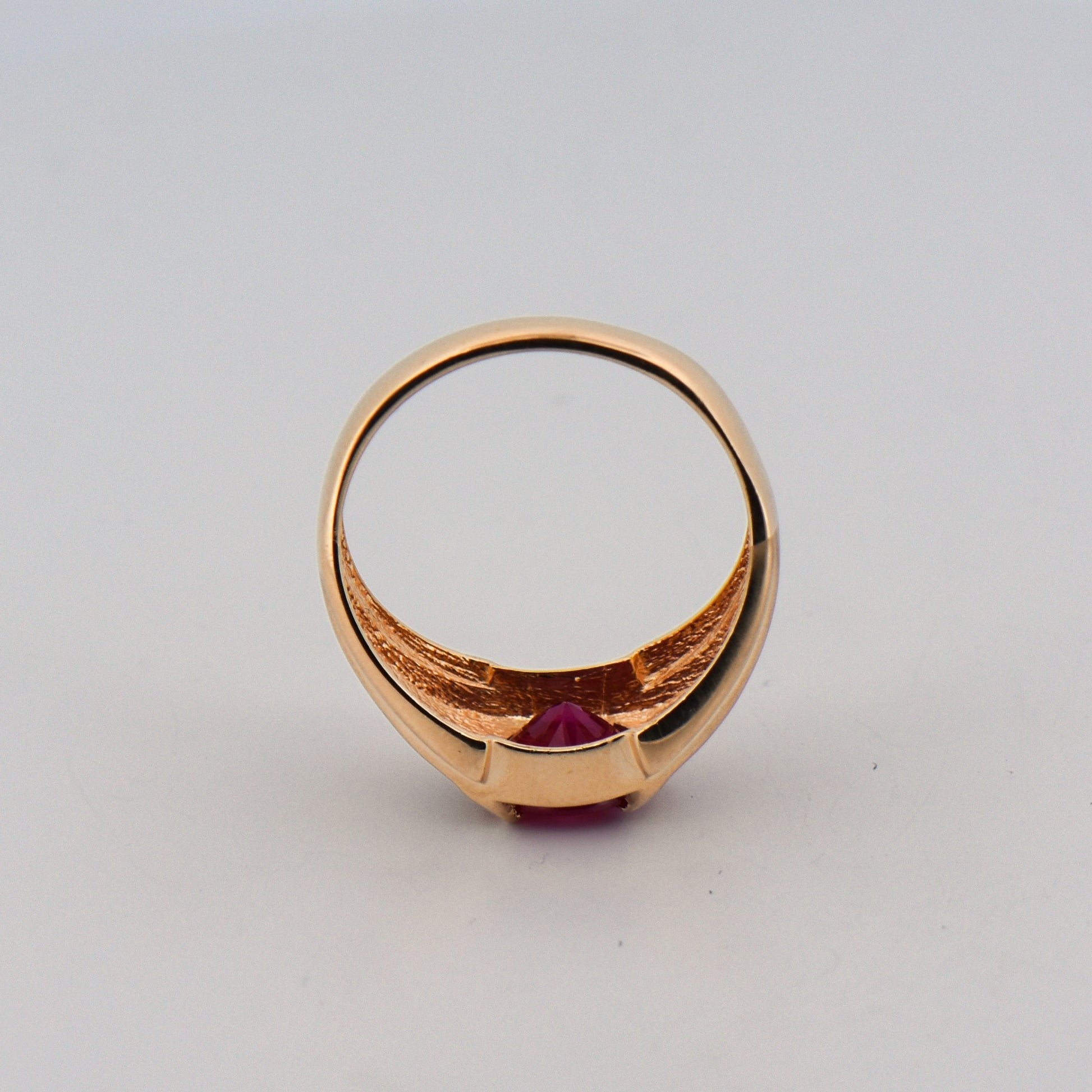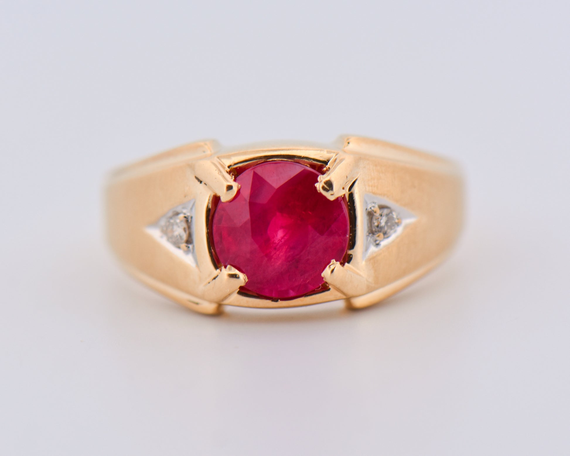 This elegant ruby men's ring originates from the mid-century era, when a stylish right-hand ring symbolized success among gentlemen. The ring is crafted from solid 10k yellow gold, chosen for its durability rather than cost, and features three stones: a natural ruby and two diamond accents.