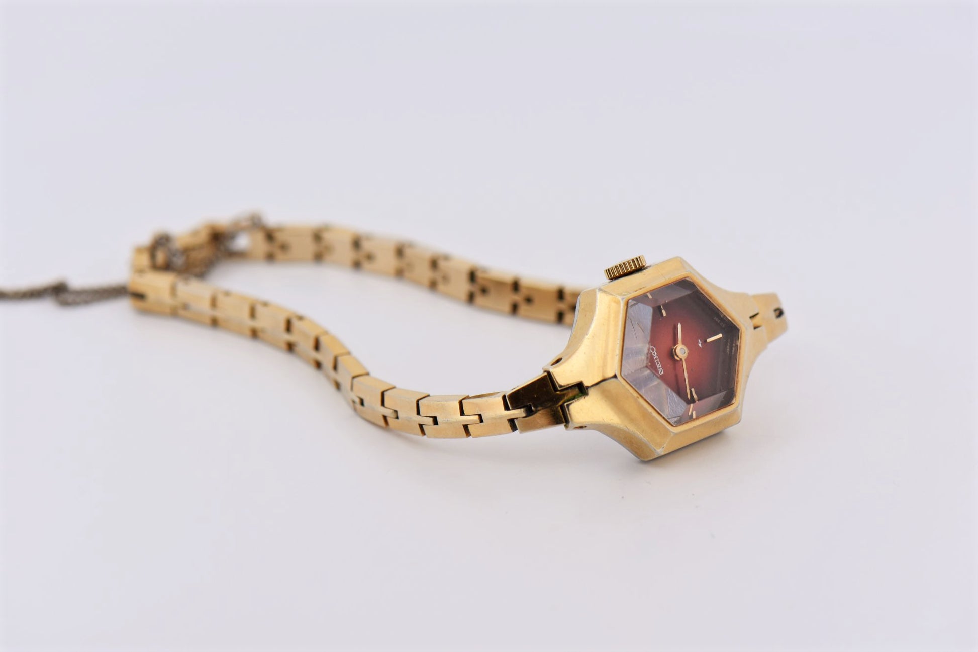 Details: Vintage Seiko ladies wristwatch with hexagonal gold-plated case and integrated bracelet; bronze sunburst dial; mechanical movement; circa 1970s.