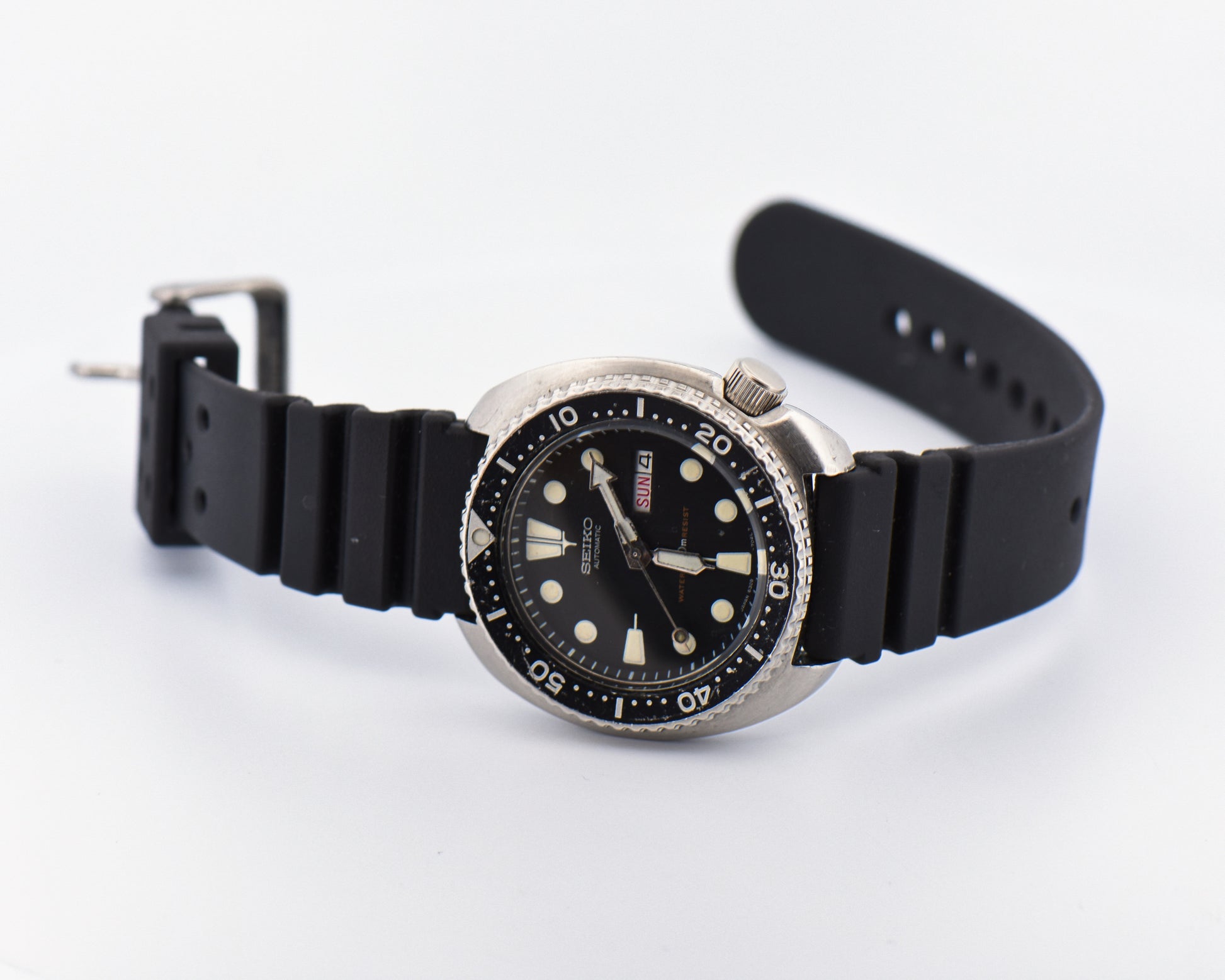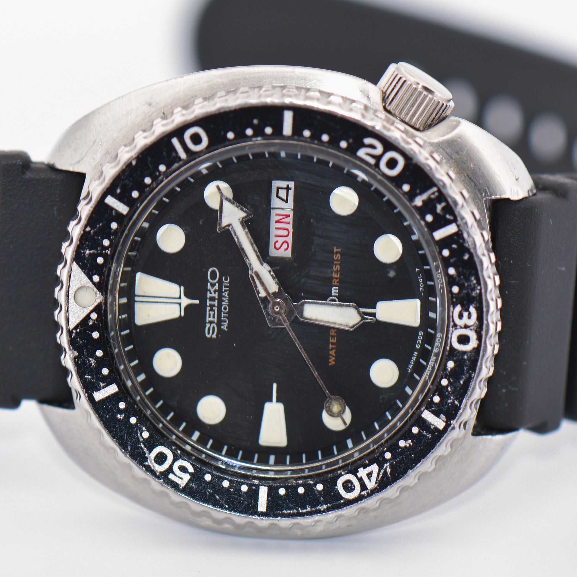 Details: Vintage Seiko automatic diver's watch (model 6309-7049) in stainless steel with black dial and rubber strap; automatic movement; day-date display; water-resistant; circa 1980.