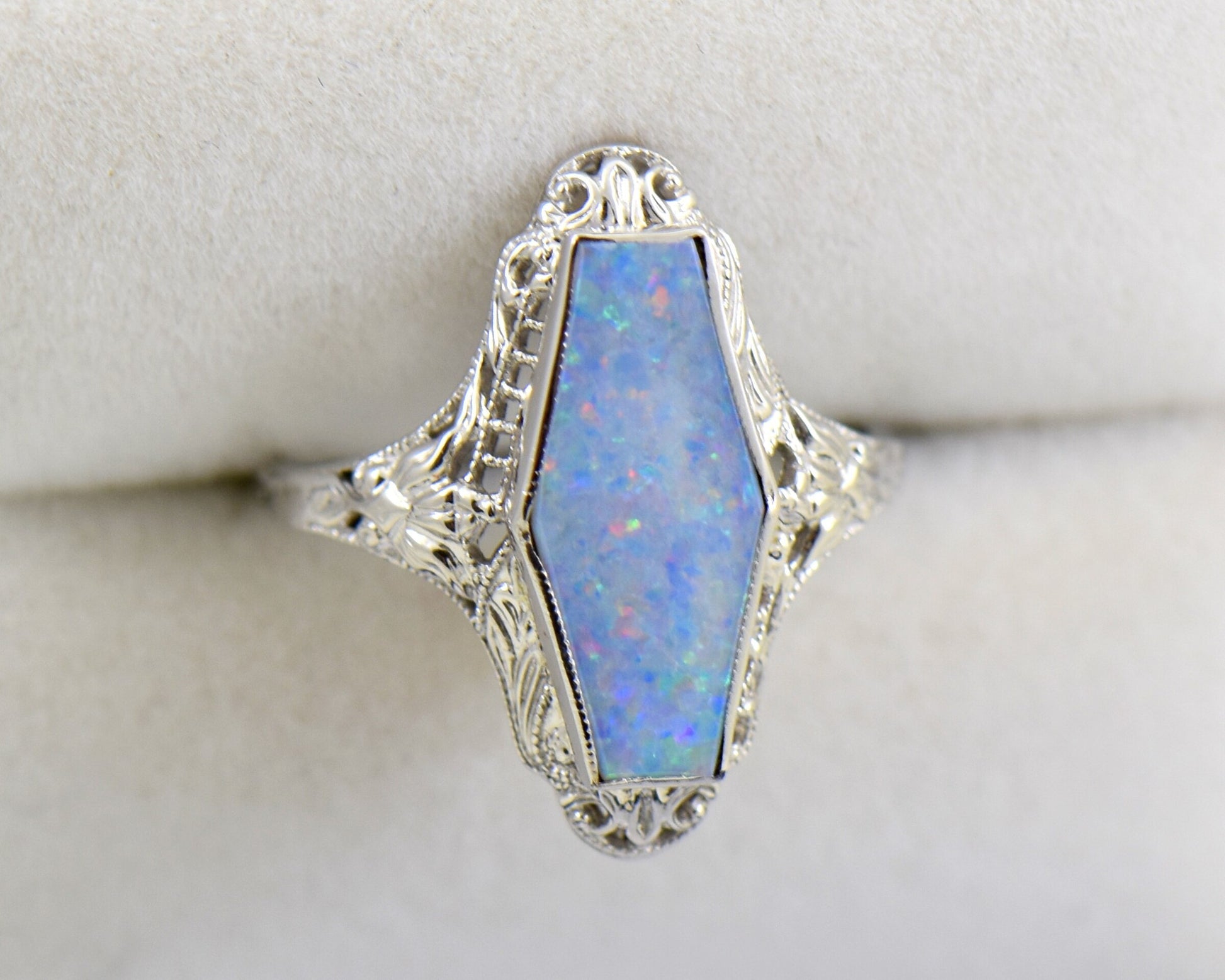 This stunning Art Deco bauble is a true survivor! The owner of this ring must have cherished and meticulously cared for it, as it remains in pristine condition. The centerpiece is an Australian grey opal that is predominantly blue, displaying subtle pinfire flashes of pink, orange, and green. It is cut into an unusual elongated hexagon, known as a coffin cut, and is elegantly framed in a thin white gold bezel. The entire ring was crafted using the die-struck process, which allowed for the creation of thin yet durable mountings that could then be adorned with intricate filigree designs. This style was at the height of fashion in the 1920s, and it continues to be timeless today.