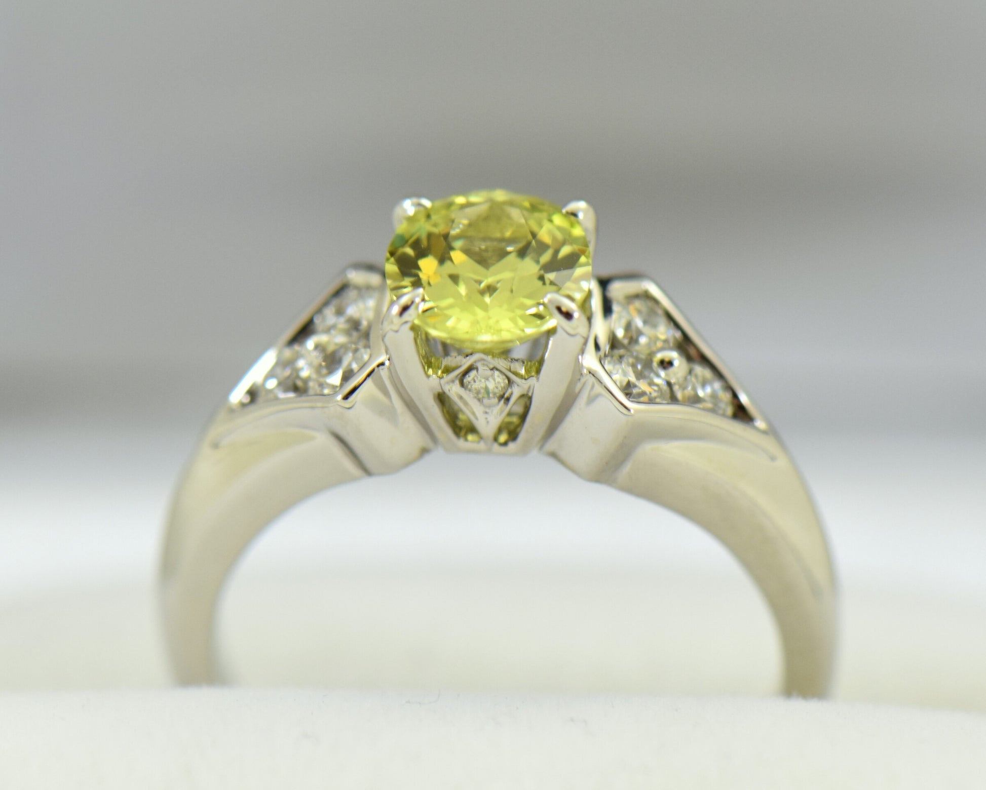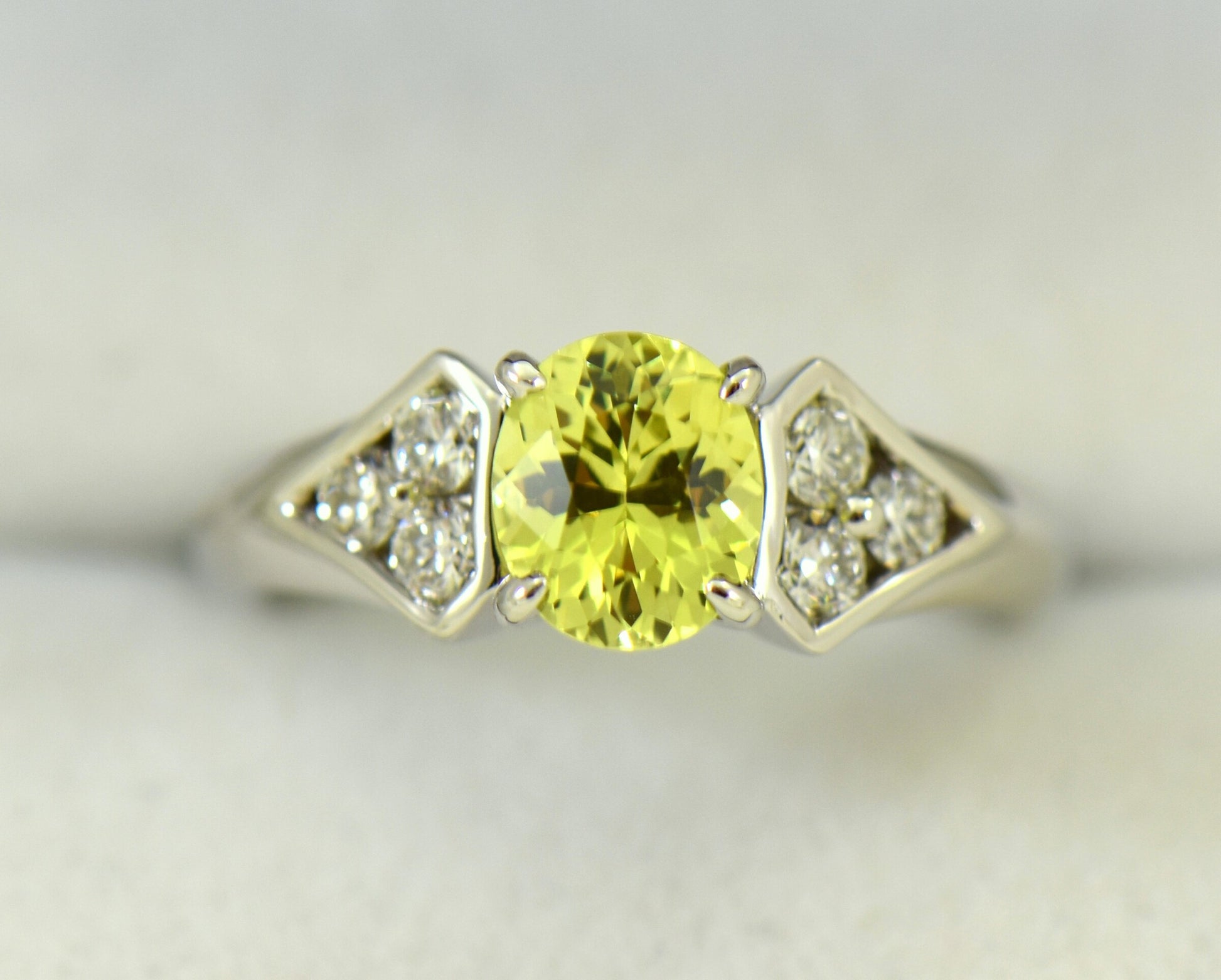This beautiful yellow engagement ring is sure to bring a touch of sunshine to your finger! The center gemstone is a natural chrysoberyl, a rare and durable gem that is related to alexandrite but does not exhibit color change. Chrysoberyls can come in various shades, including gold, green, and brown, with bright yellow being one of the most sought-after hues. Unlike yellow sapphires, which typically have a warmer, gold-like tone, chrysoberyls often display a secondary hue that gives them a striking neon appearance. Many clients prefer chrysoberyl because it closely resembles a natural yellow diamond.