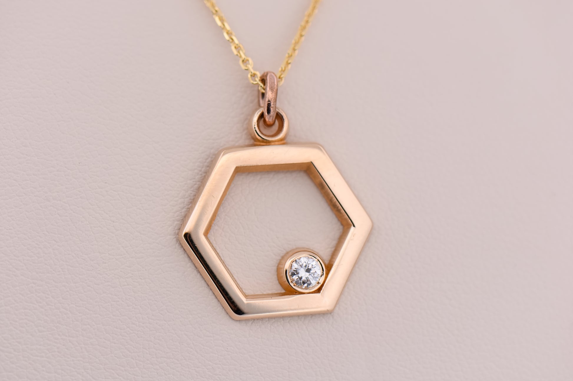 Details: 14k yellow gold open hexagon pendant featuring approx. 0.10ct bezel-set round diamond (VS2 clarity, G–H color); approx. 3.2g.
